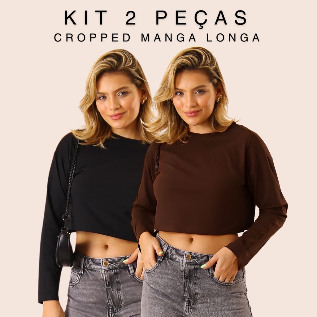 Kit 2 T-shirt Cropped Camiseta Manga Longa Oversized Blusa Feminina Outono Inverno Algodão Alba