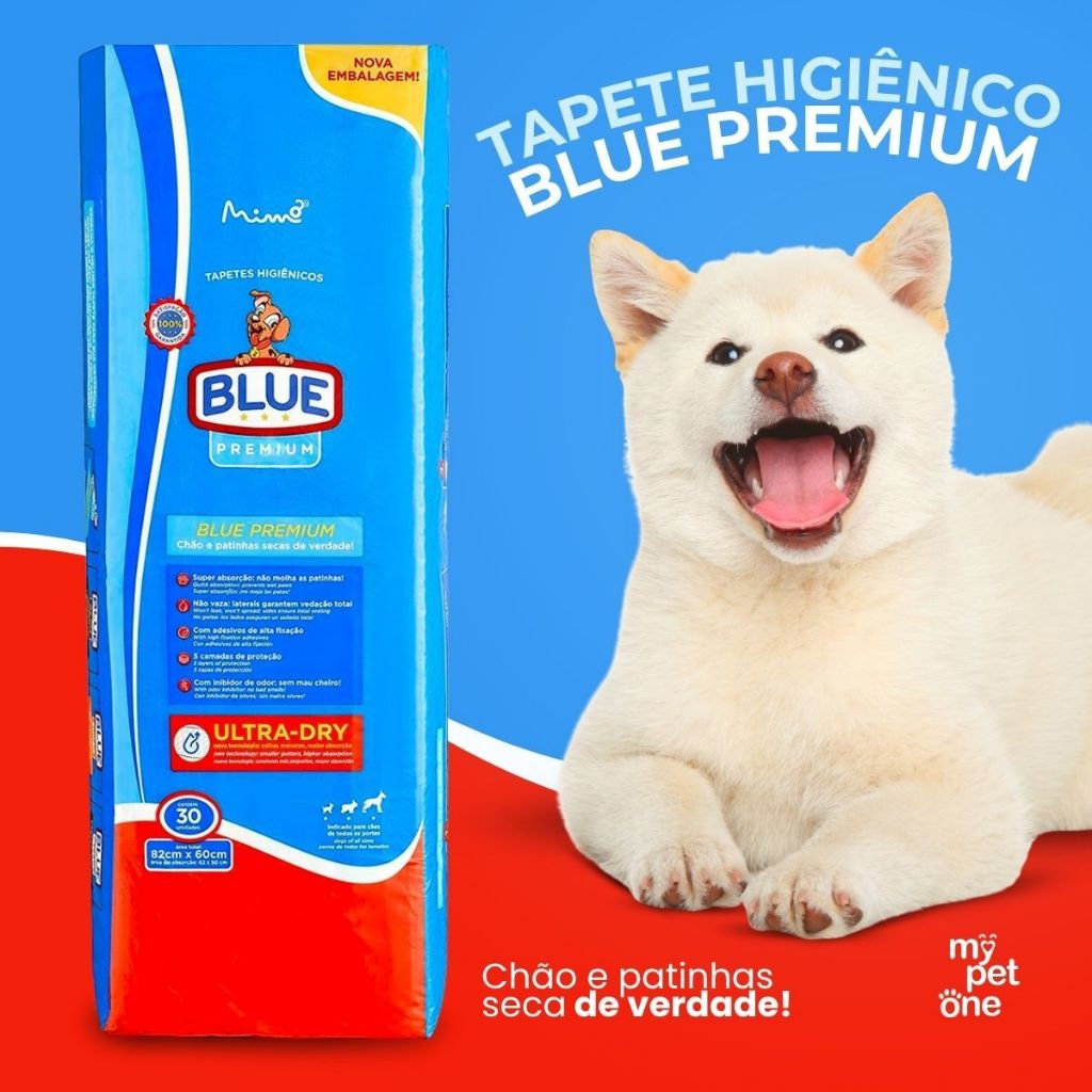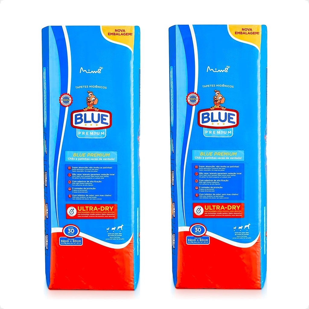 Kit 2 Tapetes Higiênicos Blue Premium 82x60 cm - 30 Unidades - Dupla camada de gel super absorvente; - Inibidor de odores; - Atrativo canino para treinamento; - Área de absorção estendida e bordas menores. Detalhes O Tapete Higiênico Blue Premium 82x60 cm - 30 Unidades foi elaborado com dupla camada de gel superabsorvente, tem inibidor de odores e atrativo canino, que ajuda a ensinar o cão onde é o local correto para fazer suas necessidades. Além de possuir uma manta protetora, que promove a rápida absorção do xixi, o Tapete Higiênico Blue Original Premium tem área de absorção estendida e bordas menores, ou seja, seu amigo tem uma área maior para fazer xixi sem isso significar vazamentos e sujeira no seu piso. Dicas Especiais Modo de usar: O Tapete Higiênico Blue Original Premium é um tapete muito simples e prático de se utilizar. Basta escolher o local que será o banheiro do seu amigo, abrir o tapete e fixa-lo no chão usando as fitas adesivas que fazem parte do produto. Conservação: Mantenha o produto armazenado em um local seco, afastado de medicamentos e produtos de limpeza. Indicação: Cachorros Porte/Raça: Raças Mini, Raças Pequenas, Raças Médias, Raças Grandes Idade: Filhotes, Adultos, Idosos Apresentação: Fardo 30 Unidades