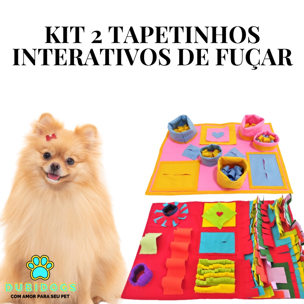 Tapete interativo confeccionado em FELTRO O tapetinho interativo da Dubidogs proporciona momentos divertidos para gastar energia mental e física do seu pet. Reforça os comportamentos naturais dos cachorros. Olfato: Utiliza para cheirar e procurar o petisco escondido Tato: Através dos diversos desafios proporcionado no tapetinho VIsão: As cores são confeccionadas de forma que chame a atenção para seu pet. Além dos estímulos físico, um enriquecimento ambiental também ajuda no alívio do estresse e ansiedade. Também ajuda a diminuir o medo do seu pet ao proporcionar um desafio novo. Tamanho tapetinho 1: Largura = 50cm Comprimento = 70cm Tamanho tapetinho 2: Largura = 35cm Comprimento = 50cm Tapete lavável na máquina no modo delicado dentro do saco lavável. ** As cores podem sofrer alterações na tonalidade conforme disponibilidade de tecido em estoque**