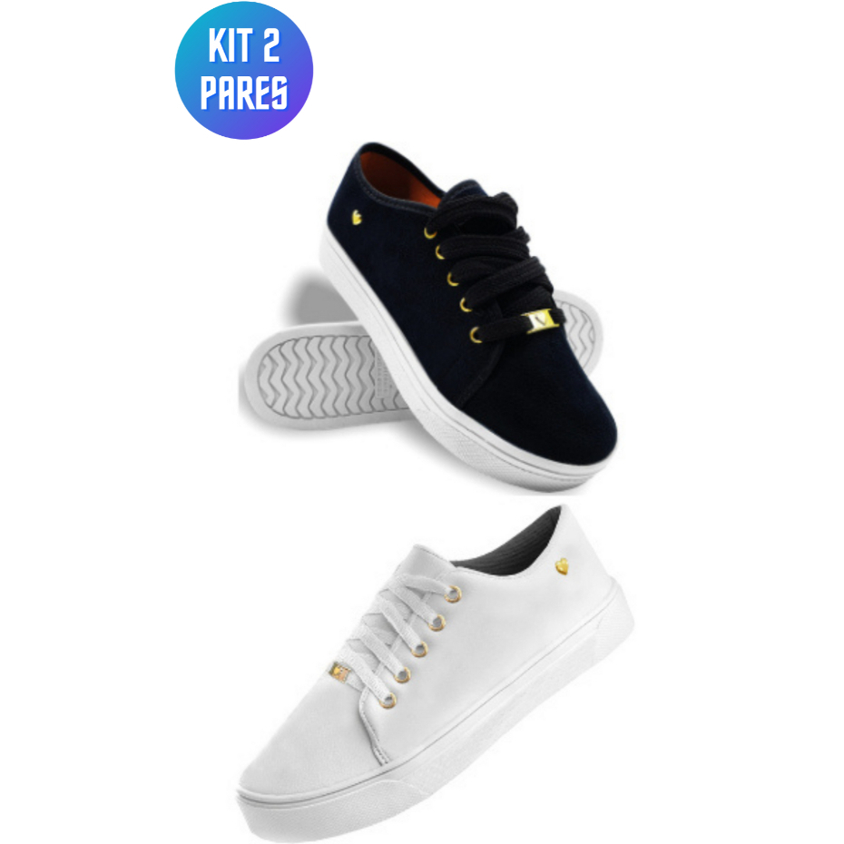Kit 2 Tênis Feminino Ping Coração Branco Preto Confort Casual Confortável Slip On