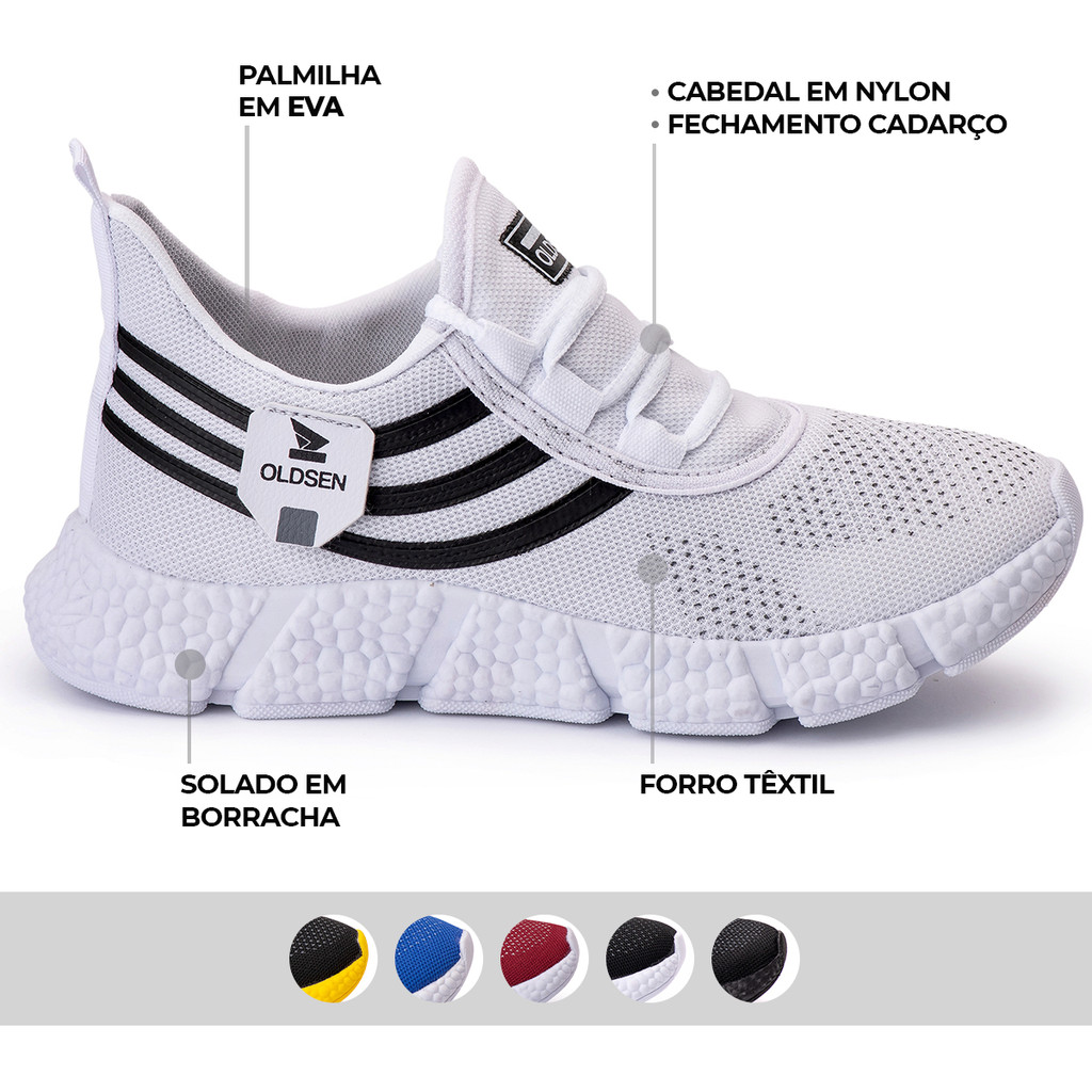 -------- Ficha Técnica -------- Material: Nylon resistente. Palmilha: Removível em EVA para super conforto e facilidade de higienização. Fechamento: Cadarço para ajuste perfeito. Solado: Borracha antiderrapante para máxima segurança. Tamanhos Disponíveis: Do 38 ao 43. Cabedal: Material super macio e leve, proporcionando excelente ventilação. Tamanhos Disponíveis: Escolha o tamanho certo com base nas medidas das palmilhas: 38= 26,0 cm, 39= 26,5 cm, 40= 27,50 cm, 41= 28,0 cm, 42= 28,5 cm, 43= 29,0 cm. Gênero: Unissex Descubra o incrível tênis Oldsen B-max! Perfeito para qualquer atividade esportiva, o tênis Oldsen B-max combina conforto, proteção e estilo moderno em um calçado esportivo. Seja para corrida, academia, caminhada ou treinos em geral, este tênis é a sua melhor escolha! Design Moderno: Seu design esportivo destaca-se por cores variadas e tons alegres, garantindo um visual elegante e atemporal. É ideal para ser usado em qualquer ocasião!