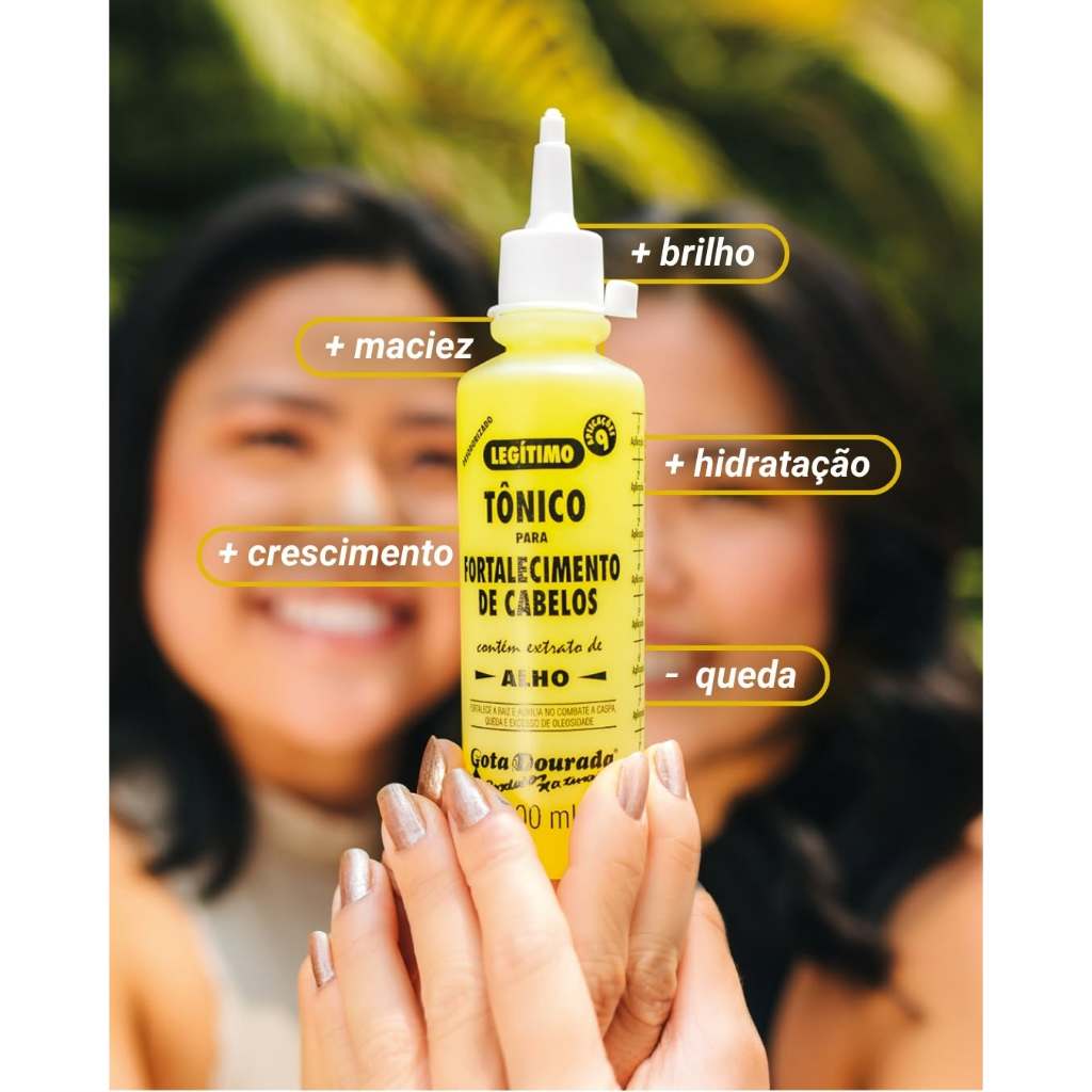 Tônico Fortalecimento Tradicional Gota Dourada 100 ml: Diga Adeus à Queda e Olá aos Fios Fortes! Cansado de ver seus cabelos caírem e sem vida? O Tônico Fortalecimento Tradicional Gota Dourada 100 ml é a solução que você precisa para revitalizar seus fios da raiz às pontas! Este tônico potente foi cuidadosamente formulado com uma combinação exclusiva de ingredientes naturais conhecidos por suas propriedades fortalecedoras e nutritivas: Óleo de Alho e Extrato de Alho: Poderosos aliados contra a queda, eles estimulam a circulação no couro cabeludo, fortalecendo a raiz e promovendo o crescimento saudável. Extrato de Aloe Vera (Babosa): Reconhecida por suas propriedades hidratantes e calmantes, a aloe vera cuida do couro cabeludo, deixando-o saudável para que seus cabelos cresçam fortes. Calêndula: Um toque final para a vitalidade dos seus cabelos, contribuindo para um couro cabeludo equilibrado e fios mais resistentes. Agindo diretamente no couro cabeludo, o Tônico Gota Dourada entrega todos esses benefícios onde mais importa, proporcionando não apenas um alívio da queda, mas também uma explosão de vitalidade e força para seus cabelos. Prepare-se para sentir a diferença: fios mais densos, resistentes e cheios de brilho! Este kit contém: 02 unidades do Tônico Fortalecimento Tradicional Gota Dourada 100 ml