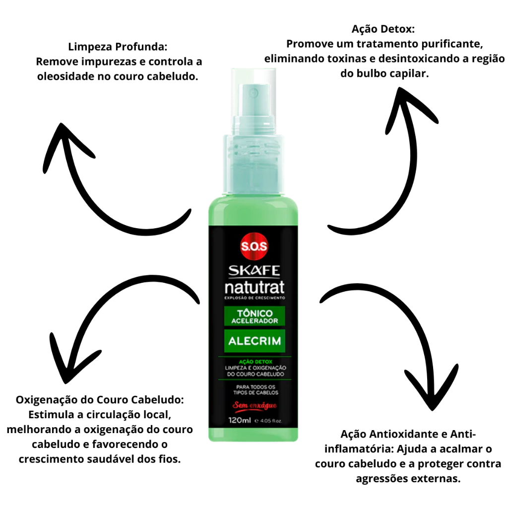 💥 Tratamento completo para crescimento, força e combate à queda! Ideal para todos os tipos de cabelo, este kit da Natutrat une os efeitos detox do Alecrim com o poder da Bomba de Vitaminas, agindo diretamente no couro cabeludo para fortalecer os fios da raiz às pontas. ✅ Contém: 1x Tônico Capilar Acelerador de Alecrim 120ml 1x Tônico Capilar Antiqueda Bomba de Vitaminas 120ml 🌿 Tônico Capilar Acelerador de Alecrim – Detox e Crescimento Ação detox que limpa e purifica o couro cabeludo Estimula a circulação no bulbo capilar Reduz caspa e oleosidade Favorece o crescimento saudável dos fios Rico em Alecrim, Arnica, Capsicum e Mentol 🧪 Indicado para cabelos com crescimento lento, excesso de oleosidade e caspa. 💊 Tônico Capilar Antiqueda Bomba de Vitaminas – Fortalecimento Imediato Combate a queda capilar desde a raiz Fortalece o couro cabeludo e os fios Rico em Panthenol, Clavo, Jaborandi e Vitaminas Nutrição profunda para estimular o crescimento 🚫 Livre de silicones pesados | Uso diário | Não precisa enxaguar 🧴 Modo de uso: Com os cabelos limpos e secos ou úmidos, aplique diretamente no couro cabeludo. Massageie suavemente com as pontas dos dedos para ativar a circulação. Não enxágue. Pode ser usado diariamente ou conforme necessidade. 📦 Benefícios em Destaque: ✅ Combate à queda ✅ Crescimento capilar acelerado ✅ Redução da caspa e oleosidade ✅ Nutrição e fortalecimento da raiz ✅ Resultados visíveis com uso contínuo
