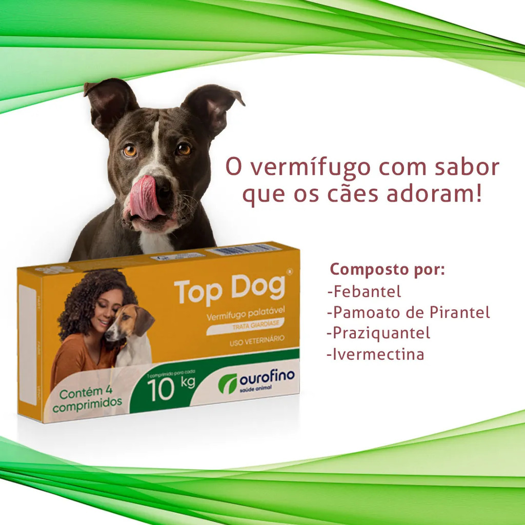Kit 2 Caixas ORIGINAIS de Top Dog para Cães de até 10 Kg Vermifugo - 4 Comprimidos Vermífugo Palatável Ourofino Mantenha a saúde e o bem-estar do seu cão com o Top Dog® Ourofino, um vermífugo palatável de amplo espectro indicado para o combate eficaz de vermes redondos, vermes chatos e giardíase. Com fórmula moderna e segura, é ideal para cães de todas as idades e tamanhos, respeitando a dose indicada conforme o peso do animal. Indicado para: - Vermes redondos (Ancylostoma caninum, Toxocara canis) - Vermes chatos (Dipylidium caninum) - Protozoários (Giardia sp.) Benefícios do Top Dog®: - Alta palatabilidade: fácil aceitação pelos cães - Ação rápida e eficaz contra verminoses e giardíase - Seguro e com ampla margem terapêutica - Diferentes apresentações conforme o peso do pet - Pode ser usado em protocolos estratégicos de vermifugação Fácil administração: - Top Dog 2,5 kg: 1 comprimido para cada 2,5 kg - Top Dog 10 kg: 1 comprimido para cada 10 kg - Top Dog 30 kg: 1 comprimido para cada 30 kg Modo de uso: Via oral. A dosagem varia conforme o peso do animal e a apresentação escolhida. Consulte o médico-veterinário para definir o melhor protocolo, especialmente em casos de giardíase, onde o tratamento é por três dias consecutivos. Recomendações importantes: - Manter o ambiente sempre limpo para evitar reinfestações - Vermifugar todos os animais da casa simultaneamente - Não utilizar em filhotes com menos de duas semanas ou em fêmeas gestantes/lactantes sem orientação profissional