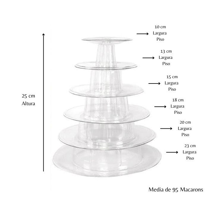 Kit 2 Torres de macarons 6 Pisos Enviado DUAS Torres de 6 Pisos -Torre para Macarons 06 Pisos -Quantidade aproximada para 95 Macarons -Tipo de material: PET -Tamanho Montada: 25 cm Altura, 23 cm de largura Sexto Piso , 20 cm de largura Quinto piso, 18 cm de largura Quarto Piso, 15 cm de largura Terceiro Piso, 13 cm Segundo Piso, 10 cm Primeiro Piso. -Tamanho Desmontada: 9,5 cm. Vendemos somente a torre sem os macarons. Imagens meramente ilustrativas.