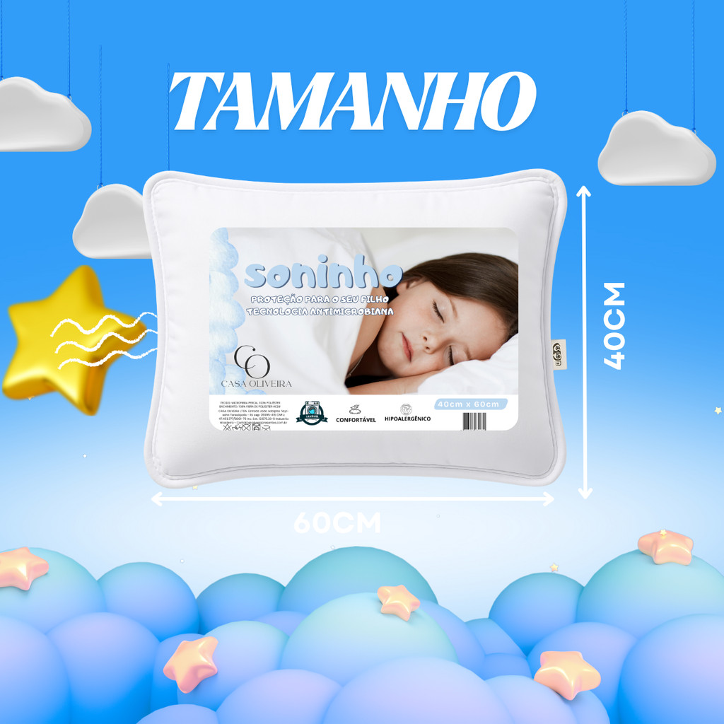 🌈Kit 2 Travesseiros Infantil Soninho - CASA OLIVEIRA 🌟 Conforto e segurança para seu pequeno. O nosso travesseiro Soninho é feito com materiais 100% antialérgicos. Tanto seu tecido, quanto a fibra, é de extrema qualidade e possui tecnologia antialérgica e antimofo. Produzido 100% com fibras siliconadas brancas, sem nenhum tipo de mistura ou espumas. ✔️ Antialérgico e Hipoalergênico: Feito com materiais premium, nosso travesseiro é suave e delicado, perfeito para a pele sensível dos bebês e crianças, garantindo um sono restaurador. ✔️ Antissufocante: A segurança dos pequenos é a nossa prioridade. Com um design cuidadosamente pensado, este travesseiro oferece ventilação adequada e suporte suave, reduzindo o risco de sufocamento e proporcionando uma noite de sono segura. ✔️ 100% Laváveis em Máquina: Nosso travesseiro pode ser lavado em máquina, sem perder suas características. ✔️ Tamanho Ideal: Com medidas de 60x40cm. 🌟 BENEFÍCIOS: - DIRETO DA FÁBRICA - Acabamento Perfeito - Design Único - Enchimento Fibra Siliconada - Tecido De Alta Gramatura - Travesseiros Cheios - Antialérgico, Antiácaro e Lavável 🌟 CONTÉM: - 2 TRAVESSEIROS ✔️ TAMANHO: - 60x40x12cm ✔️ COMPOSIÇÃO: - REVESTIMENTO: Microfibra Percal