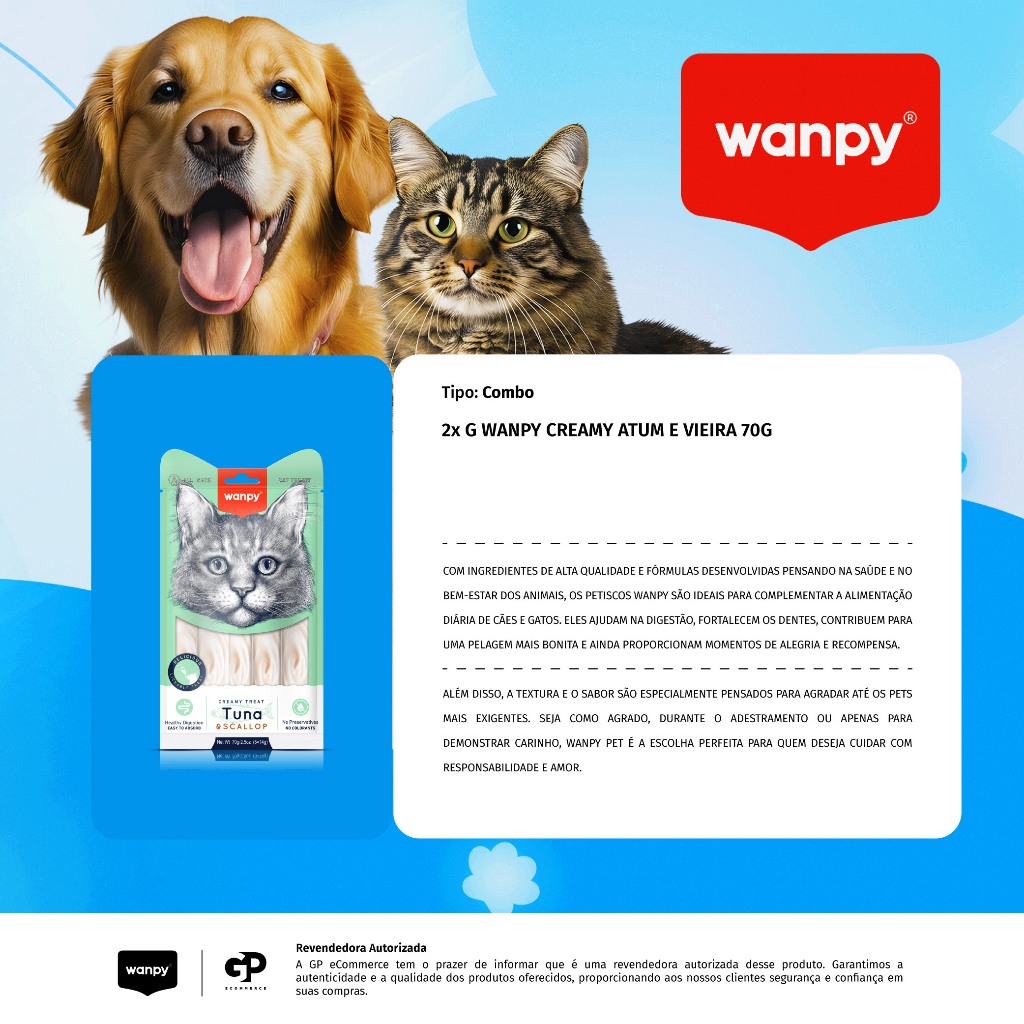 PRODUTO ORIGINAL COM NOTA FISCAL! - - - - - APRESENTAÇÃO: COMBO 2 x G Wanpy Creamy Atum e Vieira 70G - - - - - - - - - - DESCRIÇÃO: Muito mais do que um petisco, um momento de conexão entre você o seu pet! Os Creamies de Atum e Vieira promovem um aumento na ingestão hídrica dos MIAUmigos, com diversas opções saborosas. Você pode adicionar o creamy junto com a ração seca, ou oferecer diretamente para o gato. O formato de tubo da embalagem permite que o gatinho consuma o petisco direto na embalagem, o que faz dele o aliado perfeito para momentos como cortar as unhas, dar medicamentos, ou até mesmo promover um momento de conexão entre você e seu pet. Possuem vitaminas em sua composição, e são livres de corantes ou conservantes artificiais. Cremoso, nutritivo, irresistível e muuuito maior! - - - - - MODO DE USO: Ofereça a recomendação diária descrita na embalagem ou sempre que necessário para agrado do seu pet! Tal petisco não substitui o alimento comleto :) . - - - - - - - - - - Enviamos o seu pedido o quanto antes possível! Agradecemos a preferência.