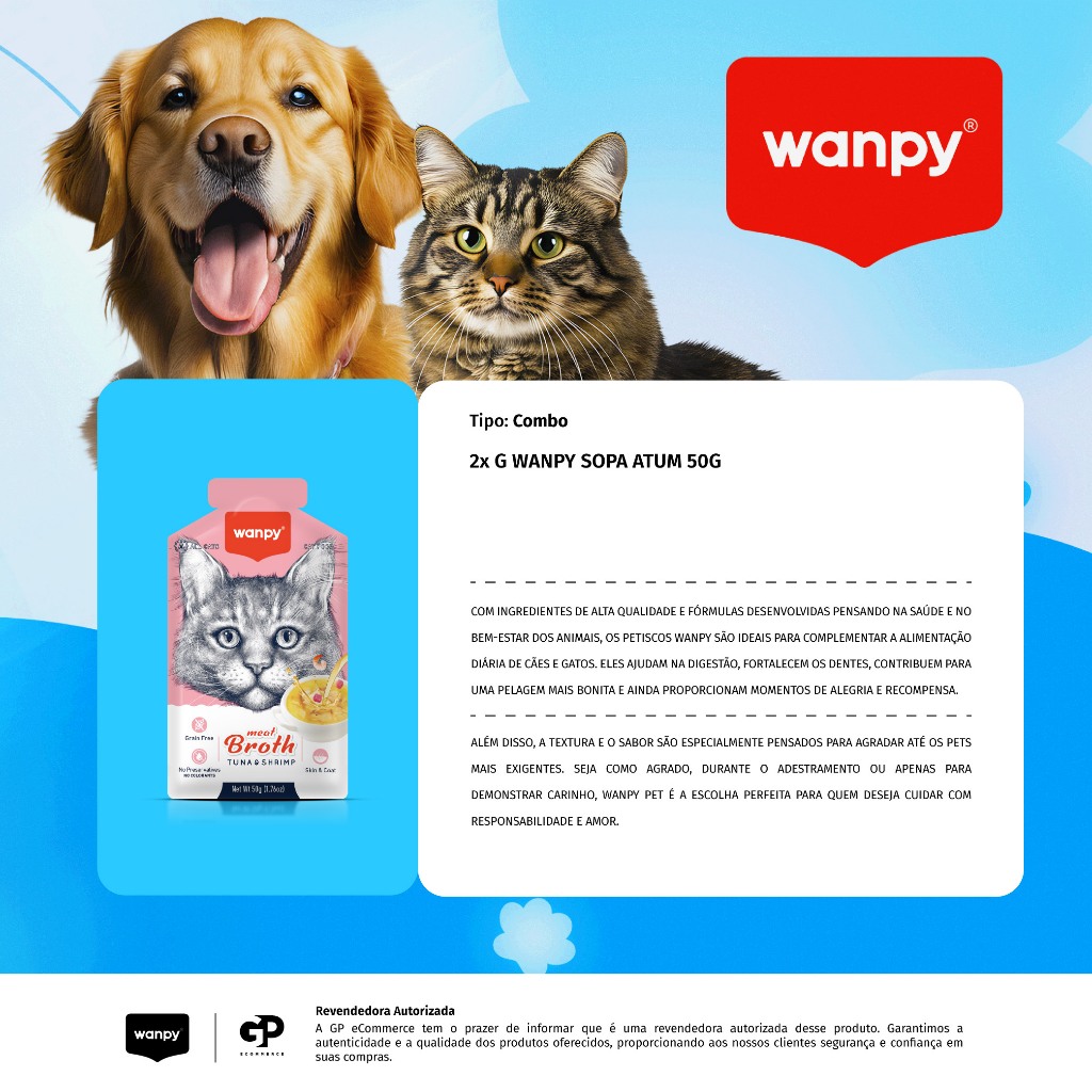 PRODUTO ORIGINAL COM NOTA FISCAL! - - - - - APRESENTAÇÃO: COMBO 2 x G Wanpy Sopa Atum e Camarao 50G - - - - - - - - - - DESCRIÇÃO: Muito mais do que um petisco, um momento de conexão entre você o seu pet! A linha de Sopinha para Gatos da Wanpy oferece uma opção prática, nutritiva e saborosa, auxiliando na ingestão hídrica do felino. Sabor Atum e Camarão , sem corantes ou conservantes artificiais, são feitos com os caldos de suas proteínas. Pode ser misturado com a ração seca e outros petiscos também, uma alternativa saborosa e funcional! - - - - - MODO DE USO: Ofereça a recomendação diária descrita na embalagem ou sempre que necessário para agrado do seu pet! Tal petisco não substitui o alimento comleto :) . - - - - - - - - - - Enviamos o seu pedido o quanto antes possível! Agradecemos a preferência.