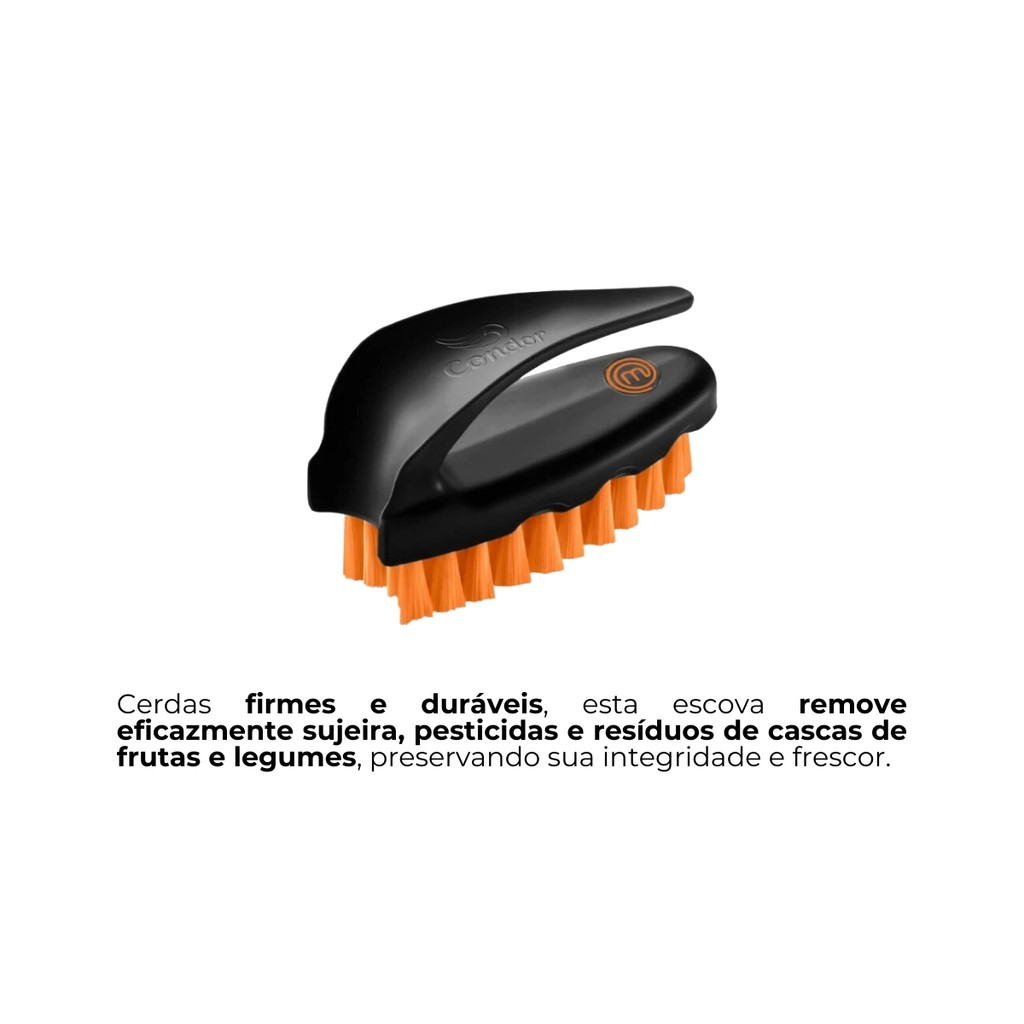 KIT 2 UN - ESCOVA LAVA LEGUMES FRUTAS CERDAS MACIAS MASTER CHEF - CONDOR O Kit com 2 unidades da Escova Lava Legumes e Frutas Master Chef da Condor, é a ideal para tornar o processo de limpeza dos legumes/frutas de forma muito mais eficiente e prática. A escova foi feita para facilitar a remoção de sujeira, impurezas e resíduos dos seus legumes, o que garante uma alimentação mais saudável. A Escova possui cerdas firmes e resistentes, que remove de maneira eficaz toda a sujeira e resíduo presentes na superfície dos alimentos, incluindo terra, pesticidas e outros contaminantes indesejados. Assim, você pode desfrutar de alimentos limpos e frescos em sua mesa. Permite o consumo seguro e nutritivo de frutas e legumes/vegetais com casca. A Escova possui um design ergonômico, que se encaixa perfeitamente em suas mãos, proporcionando conforto e facilidade durante o uso. E também que permite que você aplique a quantidade certa de pressão para uma limpeza adequada, sem esforço excessivo. É fabricada com materiais de alta qualidade, a Escova Lava Legumes é resistente e projetada para suportar o uso diário, as cerdas duráveis garantem uma vida útil prolongada, proporcionando uma solução confiável para a higienização dos seus alimentos. DICA DE USO: Após a utilização, a limpeza da escova é rápida e prática. Basta enxaguá-la em água corrente e deixar secar. Suas cerdas não retêm umidade, evitando a proliferação de bactérias. COMPOSIÇÃO BÁSICA: Pigmento, matéria sintética e metal.