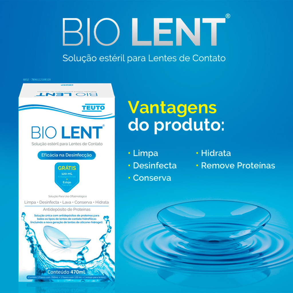 Kit 2 un Bio Lente Solução Lente de Contato 350 ml + 120 mlO Bio Lent está disponível na apresentação de kit, contendo 1 frasco com 350ml, 1 frasco com 120ml e 1 estojo para lentes. A apresentação contém o Poloxamer, que é um detergente não iônico, que permite a mobilização, emulsão e eliminação de depósitos que se acumulam sobre a superfície das lentes de contato. As propriedades antiaderentes deste produto evitam a aderência de microrganismos à superfície das lentes de contato gelatinosas, aumentam o nível de proteção dos usuários de lentes de contato contra infecções e ceratite. Bio Lent é um produto multiação, limpa, desinfeta, hidrata e deixa a lente límpida. O produto proporciona uma maior vida útil para a lente, além de confordo para os usuários, facilitando a adesão as lentes.