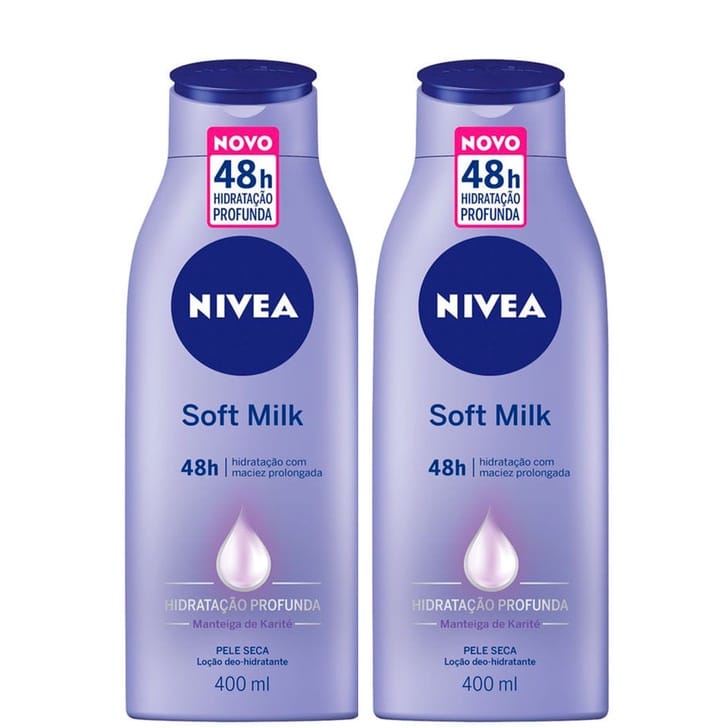 Kit com duas unidades Hidratante Nívea Milk - 400ml cada,Kit com duas unidades Hidratante Nívea Soft Milk - 400ml cada Pele seca e Extra-seca A Loção Nivea Milk Hidratação Profunda é um hidratante corporal capaz de hidratar profundamente peles secas e extra-secas por até 48 horas. Sua fórmula conta com a tecnologia Hydra QI, que estimula o sistema de hidratação natural da pele. Também possui Óleo de Amêndoas, um ativo super hidratante que promove proteção eficaz contra o ressecamento da derme. Seu uso proporciona uma pele hidratada e macia. Enriquecido com Manteiga de Karité, NIVEA Soft Milk proporciona hidratação prolongada para a pele seca e desodoriza a pele. Proporciona 48 horas de hidratação, protegendo a pele contra o ressecamento, deixando-a desodorizada e com uma gostosa sensação de suavidade.