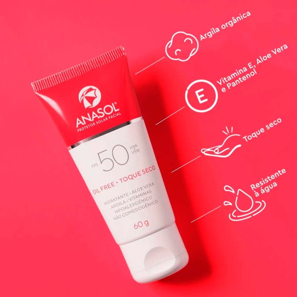 Kit Anasol FPS 50 Facial 60g + FPS 50 Corpo 200g Apresentação: FPS 50 - 200 g + FPS 50 Facial - 60 g. • Kit promocional com preço especial. • Para aproveitar o sol sem medo e proteger o corpo e o rosto. • Associam vitaminas e agentes hidratantes para uma pele protegida e bem cuidada. • Oil free, não comedogênico e hipoalergênico. FPS 50 corporal 200g - Dupla proteção UVA/UVB. • Contém Vitamina E com ação antioxidante e Aloe Vera com ação hidratante. • Indicado para pele muito sensível a queimaduras solares. • Dermatologicamente testado, hipoalergênico, não comedogênico e oil free. • Muito resistente à água. MBBT, DHHB e Dióxido de Titânio. FPS 50 Facial 60 g. • FPS 50 - Dupla proteção UVA/UVB. • Contém polímero natural que promove efeito matte e toque seco. • Argila orgânica que auxilia no controle da oleosidade e repõe minerais à pele. • Vitamina E, Aloe Vera e Pantenol com ação hidratante e antioxidante. • Resistente à água, dermatologicamente testado, não comedogênico e oil free. • Uso diário. MBBT, Dióxido de Titânio e DHHB.