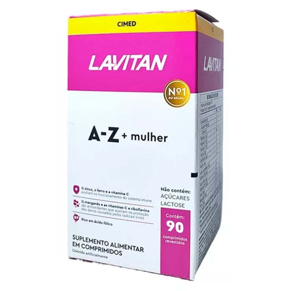 Kit 2 und Lavitan Az Mulher 90 CprSuplemento vitamínico mineral para mulheres. Complementa necessidades nutricionais femininas. Com vitaminas A, B3 B6, B12, C, D, zinco e ferro. Zero glúten, calorias e lactose. Contém 90 comprimidos.
