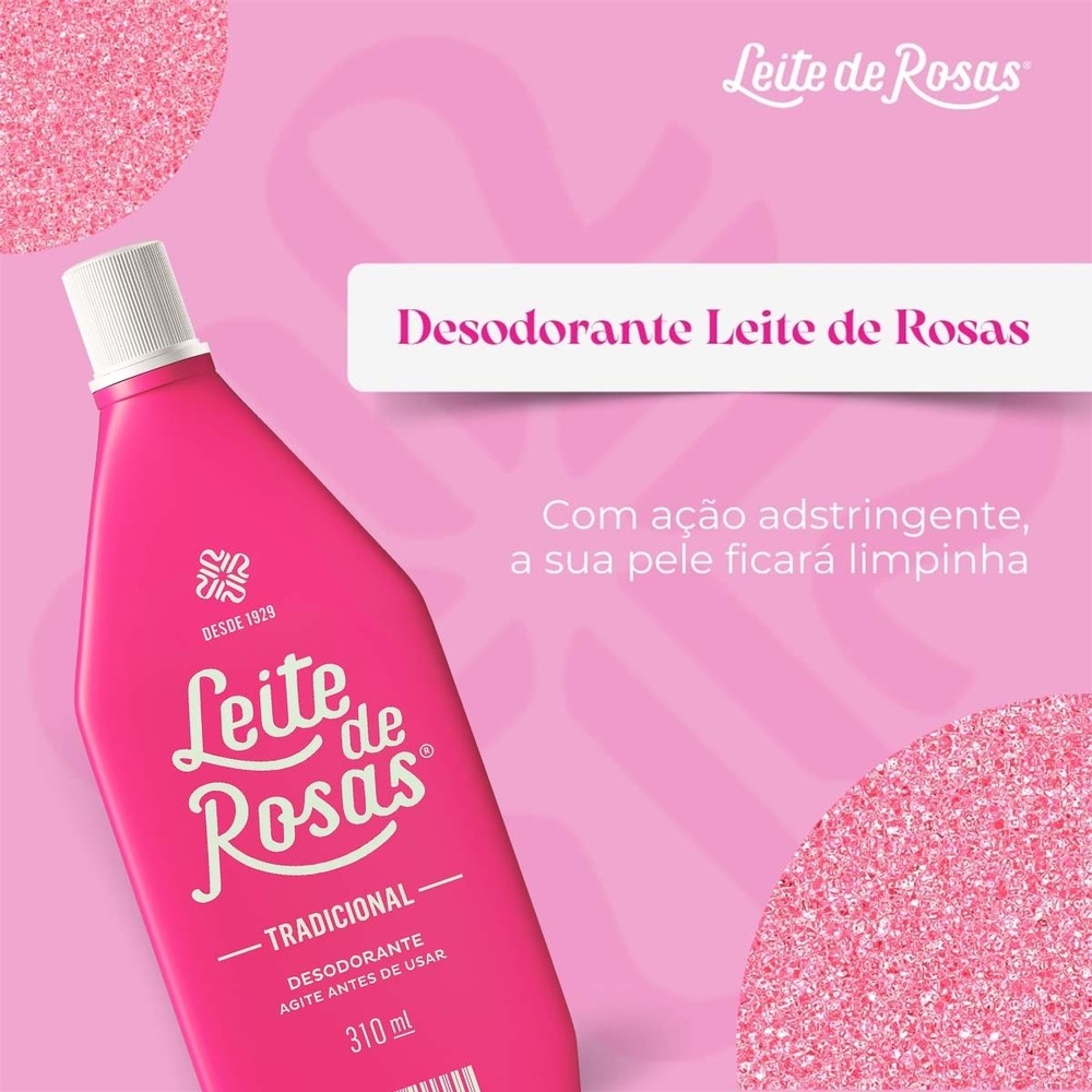 Kit 2 und Loção Leite Rosas Tradicional 310ml O Desodorante Leite De Rosas Tradicional foi desenvolvido para limpar a pele, combatendo a oleosidade, fechando os poros além de ser adstringente, sendo bastante eficaz para retirar maquiagem e limpar os rostos das impurezas do dia-a-dia.