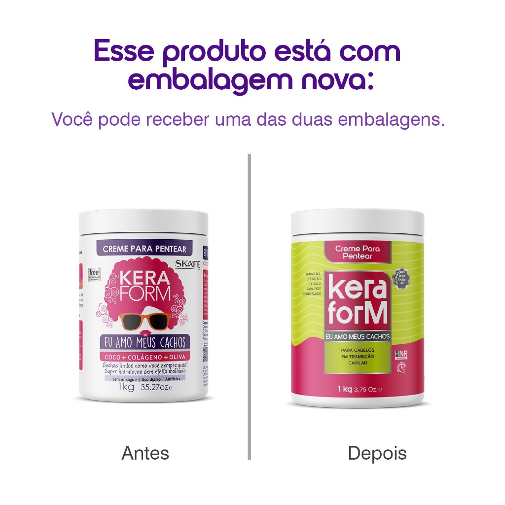 CREME PARA PENTEAR KERAFORM CACHOS DEFINIDOS E AMO MEUS CACHOS 1 KG CADA CACHOS DEFINIDOS Cachos lindos como você sempre quis! Agora é possível ter cabelos Mega Hidratados e com Nutrição Máxima. Um tratamento de Salão dentro da sua Casa! Super hidratação sem efeito molhado. O Creme Para Pentear Keraform Cachos Definidos restaura os fios, controla o volume e mantém os cachos definidos por mais tempo. Fonte de nutrientes essenciais e de ativos superconcentrados. Promove hidratação e fortalecimento dos fios. INDICADO PARA CABELOS CACHEADOS, ONDULADOS OU VOLUMOSOS. Ativos: Quinoa Pró. Colágeno ? É responsável pela elasticidade e força dos fios, rejuvenesce, proporcionando o crescimento normal e saudável. Deixando os cabelos mais brilhosos, macios, resistente, com elasticidades e flexibilidades dos fios. D-Pantenol. AMO MEUS CACHOS É totalmente livre de parabenos e petrolatos! Sua fórmula foi especialmente desenvolvida com Coco, Colágeno e Oliva. Esses ativos naturais vão nutrir, hidratar, restaurar, dar brilho e fazer com que o amor que você tem pelos seus cachos aumente a cada dia.INDICADO PARA CABELOS CACHEADOS.Ativos:- Óleo de Coco: Rico em ácidos graxos é um poderoso hidratante que age internamente nos fios, reconstruindo e fortalecendo-o, proporcionando brilho e maciez ao cabelo. - Colágeno: É responsável pela elasticidade e força dos fios, rejuvenesce, proporcionando o crescimento normal e saudável. Deixando os cabelos mais brilhosos, macios, resistente, com elasticidades e flexibilidades dos fios. - Oliva: Estimula o Crescimento saudável, ajuda na retenção de umidade da fibra Capilar.Modo de Usar:Aplique nos cabelos úmidos ou secos, espalhando uniformemente por toda a extensão dos fios. Não enxágue e penteie como de costume.
