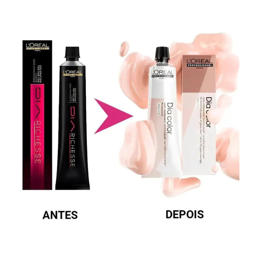 Kit contem 2 unidades mesma cor Dia Color Tonalizante loreal 60ml Dia Color da L'Oréal Professionnel é um tonalizante alcalino demipermanente, sem amoníaco, que proporciona um cabelo com um brilho excecional. A sua fórmula reverte os efeitos da perda de melanina, oferecendo até 6 semanas de cor intensa e gloss, além de cobrir até 70% dos cabelos brancos. Este tonalizante de cabelo proporciona 3 vezes mais brilho, reavivando a cor dos fios deixando-os radiante. A sua textura cremosa facilita a mistura, a aplicação e o enxaguamento, tornando o processo mais simples e confortável. Dia Color recupera a cor e o brilho através da tecnologia de reposição da melanina perdida, que replica a cor da melanina natural e preenche as lacunas causadas pela sua perda. Com até 92% de ingredientes de origem natural, oferece uma opção mais suave e cuidadosa para o cabelo. Uma escolha versátil, adequada para clientes que desejam desde uma primeira experiência de coloração até uma cobertura mais completa dos cabelos brancos, proporcionando também um toque de brilho e revitalização para cabelos naturais sem vida, já que é uma tinta de cabelo suave, brilhante e de baixa manutenção. A sua fórmula reverte os efeitos da perda de melanina, oferecendo até 6 semanas de cor intensa e gloss, além de cobrir até 70% dos cabelos brancos. Esta tinta de cabelo proporciona 3 vezes mais brilho, reavivando a cor dos fios deixando-os radiante. A sua textura cremosa facilita a mistura, a aplicação e o enxaguamento, tornando o processo mais simples e confortável. Dia Color recupera a cor e o brilho através da tecnologia de reposição da melanina perdida, que replica a cor da melanina natural e preenche as lacunas causadas pela sua perda. Com até 92% de ingredientes de origem natural, oferece uma opção mais suave e cuidadosa para o cabelo. Uma escolha versátil, adequada para clientes que desejam desde uma primeira experiência de coloração até uma cobertura mais completa dos cabelos brancos, proporcionando também um toque de brilho e revitalização para cabelos naturais sem vida, já que é uma tinta de cabelo suave, brilhante e de baixa manutenção. Principais características: Coloração alcalina sem amoníaco Até 70% de cobertura dos cabelos brancos 6 semanas de cor intensa* Cabelo com 3 vezes mais brilho** Clareia até 1 tom com tecnologia alcalina e escurece até 4 tons Proporciona reflexos e dimensão a todos os tipos e texturas de cabelo Permite personalizar os resultados com uma vasta paleta de tons, desde os loiros mais claros aos castanhos mais escuros, em tons frios, neutros e quentes Tem um impacto positivo no ambiente: utiliza menos 36% de embalagem***; menos 27 toneladas de papel****; cartão reciclado e reciclável; tubo de alumínio 95% pós-reciclado. Desenvolvido em conjunto com profissionais Modo de usar: Pode utilizar qualquer revelador Diactivateur com a cor Dia (relação de mistura: 1 + 1,5). Para melhores resultados, recomendamos: Diactivateur 6 vol. para um depósito de cor suave; Diactivateur 9 vol. para um depósito de cor médio; Diactivateur 15 vol. para um depósito de cor intenso. Utilizar luvas descartáveis adequadas. Não utilizar utensílios metálicos (taça, pente...). Utilizar apenas o Diactivateur recomendado. Numa taça, num frasco aplicador ou num shaker, misturar 60 ml (1 tubo) de Dia Color creme e adicionar 90 ml de revelador Diactivateur escolhido. Aplicar em cabelo seco. Primeira aplicação: Os 20 min de tempo de pose iniciam-se no fim da aplicação. Retoque dos crescimentos: Aplicar na zona dos crescimentos, iniciar o tempo de pose de 20 min e a seguir, distribuir imediatamente pelo restante cabelo para revitalizar a cor com um resultado mais profundo e/ou mais escuro. Distribuir pelo restante cabelo após 10 min, se os comprimentos e pontas estiverem moderadamente desvanecidos. Emulsionar nos últimos 5 min, se a cor estiver ligeiramente desvanecida. No final do tempo de exposição, emulsionar cuidadosamente durante alguns minutos. Enxaguar bem o cabelo até que a água saia limpa. Lavar com o shampoo Metal Detox