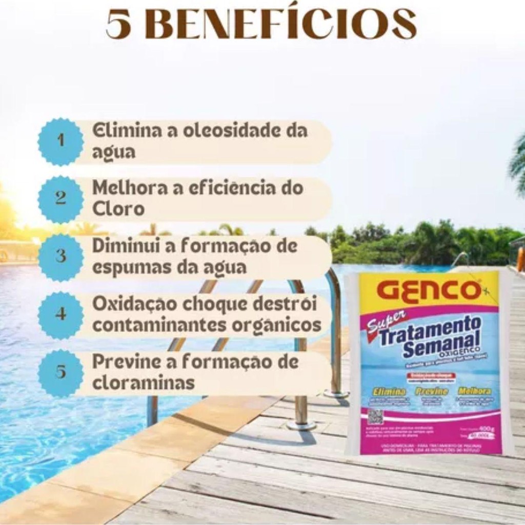 O uso contínuo de cloro pode causar cloraminas, resultando em odor desagradável, irritação na pele e olhos, e água turva, comprometendo a qualidade da piscina. O SUPER TRATAMENTO SEMANAL OXIGENCO GENCO® elimina contaminantes orgânicos, previne a formação de cloraminas e melhora a eficiência do cloro, garantindo água cristalina, sem odores e segura para os banhistas. Mantenha sua piscina sempre limpa e brilhante! Compre agora o SUPER TRATAMENTO SEMANAL OXIGENCO GENCO® (400 g)! Especificações Técnicas: Marca: GENCO Peso: 400 g Indicação: Para piscinas tratadas com cloro Benefícios: Elimina impurezas orgânicas (gorduras, oleosidades e suor) Previne o mau cheiro da piscina Evita a irritação nos olhos e pele Água limpa, brilhante e segura Rápida ação Compatível com o tratamento de cloro Itens Inclusos na Caixa: 2 x SUPER TRATAMENTO SEMANAL OXIGENCO GENCO® (400 g) Adquira agora o SUPER TRATAMENTO SEMANAL OXIGENCO GENCO e tenha uma piscina cristalina, livre de odores e sempre pronta para uso! tratamento piscina, limpeza semanal, produto oxidante, cloro, GENCO, cloraminas, eliminador de odores, irritação pele, água turva, piscina cristalina, clarificante, segurança banhistas, eficácia orgânicos.