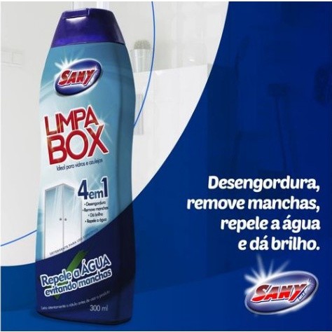Limpa Box - Ao investir no produto mais eficiente do mercado para limpar o seu box, você economiza tempo e esforço esfregando seu banheiro. - Quem já usou recomenda e não troca por nada, use e descubra as vantagens você também. - Limpa o box sany mix foi desenvolvido para facilitar a limpeza dos azulejos e louças do seu banheiro, dando brilho e desengordurando. - Deixe seu Banheiro Brilhando com o Limpa Box Sany Mix. - O limpa box é um detergente inovador com fórmula cuidadosamente criada para limpar e lustrar box. - Com Função 4 em 1 ele limpa desengordura da brilho e repele a água sem deixar manchas. ** Conteúdo: 2 unidades limpa box de 300ml cada. ** Marca: Sany