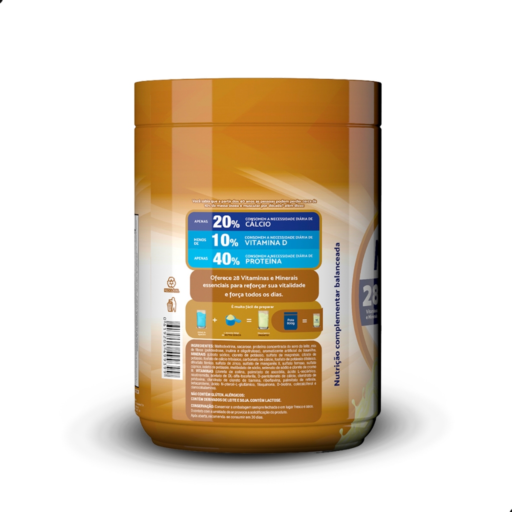 Vitalidade Diária para Adultos Mantenha sua energia e vitalidade em alta com nosso composto lácteo especialmente formulado para atender as necessidades de quem já passou dos 50 anos! Desenvolvido para adultos 50+ ele é uma ótima opção para quem busca um complemento nutricional saboroso e prático. Variedade de Sabores e Facilidade de Consumo: Disponível nos sabores Baunilha, Cappuccino, Chocolate e Natural, oferece a liberdade de escolher o que mais agrada ao seu paladar. Basta adicionar 1 dosador em 200ml de água ou leite desnatado — quente ou frio — e misturar bem até a completa dissolução. Pode ser consumido a qualquer hora do dia, seja no café da manhã, no lanche da tarde ou antes de dormir. Benefícios para a sua Saúde: Cálcio e Vitamina D: Contribuem para a manutenção de ossos fortes e saudáveis. Vitaminas do Complexo B (B1, B2, B3, B5, B6 e Biotina): Auxiliam na produção e liberação de energia, ajudando a manter sua disposição ao longo do dia. Zinco e Vitamina C: Fortalecem o sistema imunológico, aumentando suas defesas naturais. Ferro: Essencial para a formação de células vermelhas do sangue, contribuindo para o transporte eficiente de oxigênio pelo corpo. Por que Escolher Nutrasenior 800g? Desenvolvido pensando nas necessidades nutricionais de quem já passou dos 50 anos e ainda tem muito o que aproveitar, este composto lácteo é rico em nutrientes essenciais como zinco, cobre, selênio, vitaminas A, D, E, K, C, B1, B6, B12, ácido fólico e biotina. Oferece uma combinação balanceada que auxilia no fortalecimento do corpo, promovendo energia e saúde todos os dias. Modo de Armazenamento: Mantenha o pote sempre bem fechado em locais frescos, secos e inodoros. Após aberto, recomenda-se o consumo do produto em até 30 dias para garantir sua frescura e eficácia. Consumir imediatamente após o preparo para aproveitar todos os seus benefícios. Informações Importantes: Contém açúcares próprios dos ingredientes. Este não é um alimento com baixo ou reduzido valor energético. Cuide da sua saúde e bem-estar com a Vitalidade Diária para Adultos 50+ Fortaleça-se e aproveite cada momento com disposição e qualidade de vida!