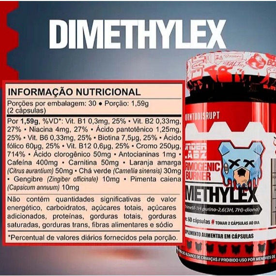 Dimethylex reina absoluto como o primeiro e único termogênico do Brasil com Burn Matrix™ 🇧🇷 São 4 mecanismos independentes em 1 termogênico, agindo de maneira inteligente: Potencializando a queima de gordura Acelerando o metabolismo Suprimindo o apetite Agindo como diurético e eliminando a retenção de líquidos Sugestão de Uso Consumir 1 cápsula duas vezes ao dia ou conforme orientação profissional