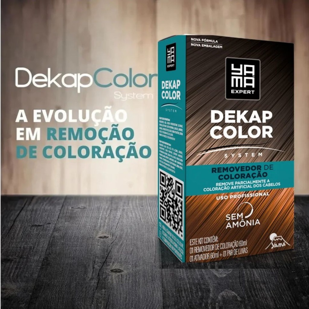 2 Kit Yamá Dekapcolor System - 120ml 🧴 Sobre o produto O DekapColor System 120 ml, da Yamá Cosméticos, é um removedor de pigmentos artificiais presente em colorações que necessitam de água oxigenada. Ele não clareia o cabelo nem altera o pigmento natural — age apenas sobre pigmentos artificiais, preservando a cor de base dos fios. Conteúdo da embalagem: Frasco de Removedor de Coloração (60 ml) Frasco de Ativador (60 ml) 1 par de luvas Diferenciais: Sem amônia e sem agentes oxidantes Não danifica a estrutura capilar Pode ser usado em cabelos com químicas como alisamentos, relaxamentos e mechas
