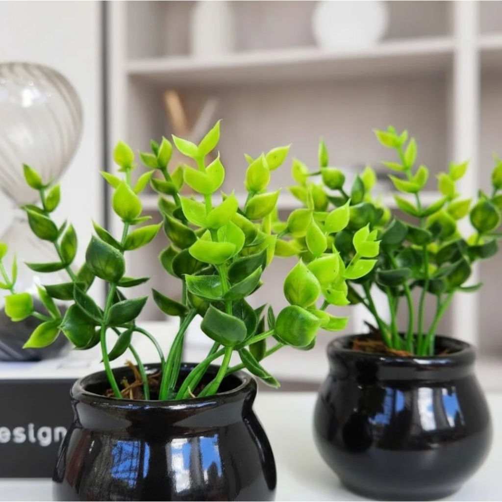 Kit 2 vasinhos de cerâmica preto ou branco com plantinha artificial para decoração