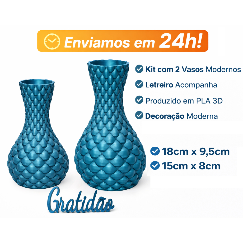 Kit com 2 Vasos Decorativos com Letreiro Leve mais charme e personalidade para sua decoração com este lindo kit de vasos decorativos produzidos em impressão 3D. Com design moderno e textura marcante, são peças ideais para compor ambientes como sala, quarto, escritório, hall de entrada e rack. O kit é composto por 2 vasos em tamanhos diferentes, perfeitos para criar uma composição harmoniosa e elegante. Medidas aproximadas: Vaso maior: 18 cm de altura x 9,5 cm de diâmetro Vaso menor: 15 cm de altura x 8 cm de diâmetro Letreiro Gratidão: 10 x 5 x 1 cm ou Letreiro Fé: 6 x 5 x 1 cm ou Letreiro Jesus: 10 x 5 x 1 cm Características do produto: Kit com 2 vasos decorativos Acompanha letreiro Produzido em PLA, material de impressão 3D de alta qualidade Design moderno e diferenciado Ideal para decoração de diversos ambientes Peças leves, bonitas e com ótimo acabamento Produto decorativo feito com tecnologia de impressão 3D, podendo apresentar marcas sutis naturais do processo, o que também reforça a autenticidade de cada peça.