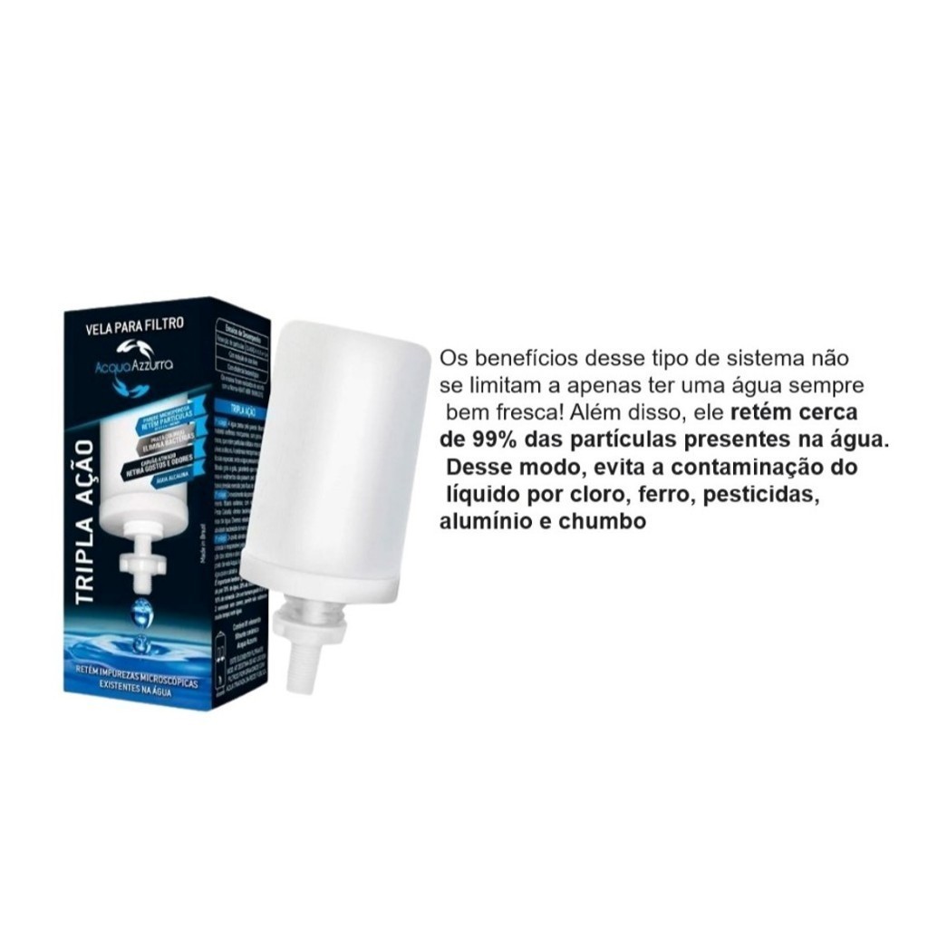 Vela Para Filtros por Gravidade OBS: As fotos são ilustrativas! DISPONIVEL NAS SEGUINTES MARCAS OASIAS E ACQUA AZZURRA ACQUA AZZURRA E OASIS (ENVIADO DEPENDENDO DA DISPONIBILIDADE DE ESTOQUE) ESTE KIT CONTEM 2 VELAS PARA FILTRO DE BARRO TRIPLA AÇÃO CONFORME CARACTERISTICAS DO ANÚNCIO Características Produto destinado à filtros por gravidade, composta por carvão ativado e nano partículas de prata, o seu processo de filtração garante água livre de bactérias, odores e sabores. As velas são compatíveis com todos os filtros por gravidade do mercado, e são o meio mais seguro de oferecer água pura e garantir saúde e bem-estar. Características: - Com Carvão Ativado e Prata - Reduz as Bactérias Presentes na Água - Reduz o Cloro e Retira Gostos e Odores na Água - Retém Todas as Impurezas Sólidas - Testado e Apriovado Especificações Tripla Ação - Este produto apresenta microporos que garantem um perfeito processo de filtragem, retendo todas as impurezas sólidas, visíveis e invisíveis presentes na água, tornando-a pura e livre de micro-organismos. Devido à sua ação declorante, o carvão ativado reduz sabores, odores e o teor de cloro. A prata adicionada à estrutura desta vela tem ação esterilizante, eliminando bactérias. Testada e aprovada conforme ensaios realizados de acordo com a norma ABNT NBR 16098:2012. Vela Tripla Ação Vela Filtro de Barro Vela Filtro Vela para Filtro Vela de Filtro de Barro Vela para Filtro Barro Vela Por Gravidade Filtro de Água Purificador de Água Purificador Água Filtro de Barro Filtro Barro Refil Filtro