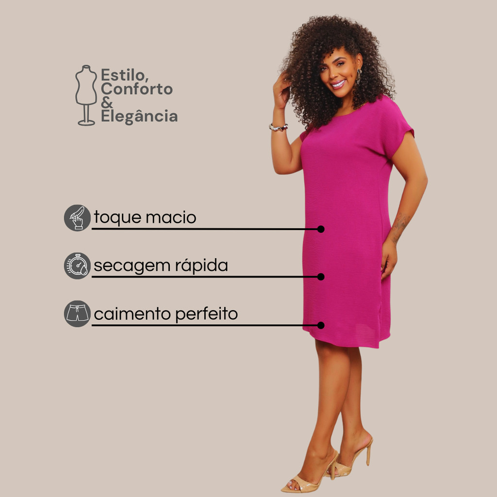 KIT 2 Vestidos Duna Plus Size O Vestido Duna Plus Size é perfeito para quem busca conforto e estilo todos os dias! Feito em 100% poliéster, ele é levinho, confortável e tem caimento soltinho que não marca o corpo ✨ Com gola redonda e manga curta, é aquele modelo básico e versátil para qualquer ocasião — trabalho, passeio, rotina ou looks fresquinhos do dia a dia 💕 Além disso, possui secagem rápida, trazendo ainda mais praticidade para você. 📏 Guia de Tamanhos GG–G1 (46/50) • Busto: 56 cm • Cintura: 55 cm • Quadril: 62 cm • Comprimento da Roupa: 1,02 m G2–G3 (52/54) • Busto: 58 cm • Cintura: 57 cm • Quadril: 64 cm • Comprimento da Roupa: 1,04 m