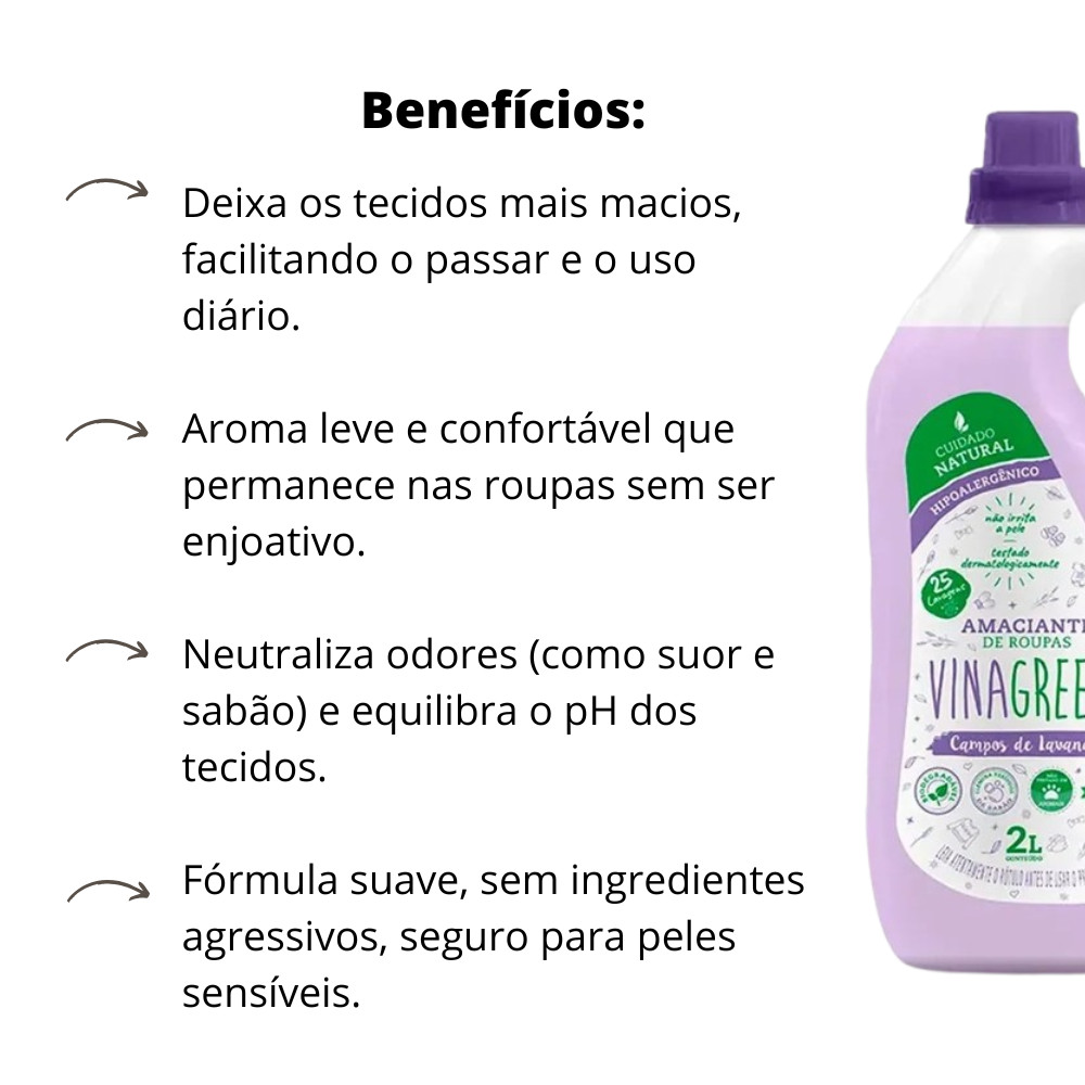 Black Friday 2025 / Ofertas Black Friday / Promoções Black Friday / Descontos Black Friday / Super Ofertas Black Friday / Black Friday online / Ofertas imperdíveis Black Friday / Preços baixos Black Friday O Amaciante de Roupas Líquido Vinagreen 2L é a união perfeita entre tecnologia de cuidado têxtil e consciência ambiental. Com fórmula exclusiva à base de ingredientes vegetais e vinagre natural, proporciona maciez intensa, neutraliza odores e remove resíduos de sabão, deixando as roupas mais leves, suaves e naturalmente perfumadas. Ideal para quem busca um amaciante eficaz, mas suave — perfeito para roupas delicadas, de bebê, toalhas, lençóis e peças íntimas. Não contém corantes agressivos nem ingredientes petroquímicos, sendo seguro para peles sensíveis e uma escolha responsável para o meio ambiente. Com rendimento de até 40 lavagens por embalagem, o Vinagreen é econômico e eficiente. Pode ser utilizado em lavagens manuais, máquinas convencionais e lava e seca, sem deixar resíduos que endurecem as fibras. O resultado são roupas fáceis de passar, com perfume leve e toque macio por muito mais tempo.