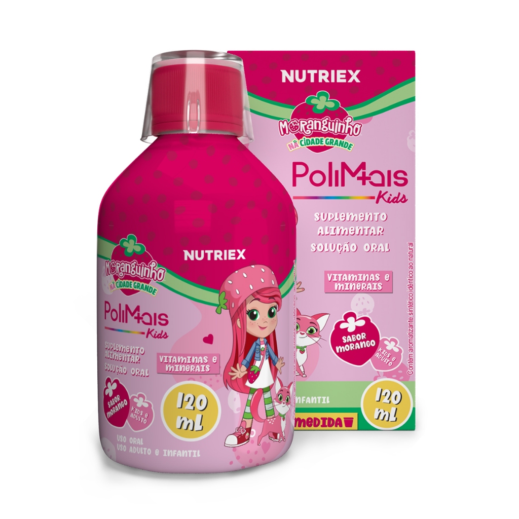 O Polimais Moranguinho 120ml é um suplemento nutraêutico completo, desenvolvido para apoiar o crescimento saudável e o bom funcionamento do organismo infantil. Com uma fórmula rica em vitaminas e minerais, de A a Zinco, e com delicioso sabor de morango, é ideal para complementar a alimentação das crianças. Benefícios: • Fórmula completa com vitaminas e minerais de A a Zinco • Sabor banana agradável e aceitação infantil • Auxilia no metabolismo energético (vitaminas C, B6, B12, Niacina, Riboflavina e Tiamina) • Contribui para o funcionamento do sistema imunológico (vitaminas A, B6, B12, C, D e Zinco) • Ação antioxidante (vitaminas C, E, Riboflavina e Zinco) • Auxilia na formação de ossos e dentes e na absorção de cálcio e fósforo (vitamina D) Sugetão de uso: Crianças > ou = 4 anos: Ingerir 5,0 mL (medir através do copo-medida) por dia durante uma das refeições. Adultos > ou = 19 anos: Ingerir 7,5 mL (medir através do copo-medida) por dia durante uma das refeições.
