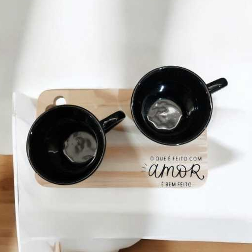 Kit com 2 Xícaras de Porcelana Preta e Base de Madeira – Sofisticação e Funcionalidade Este elegante conjunto apresenta 2 xícaras de porcelana esmaltada preta, cada uma com capacidade de 120 ml e personalizadas com a palavra "Amor". Para complementar, acompanha uma base em madeira pinus natural na cor crua, que combina charme e utilidade. Detalhes do Produto - Xícaras de Porcelana Preta: Capacidade de 120 ml, ideais para café ou chá. - Base de Madeira Pinus: Versátil e prática, pode ser usada como suporte para as xícaras ou como tábua para petiscos e frios. - Resistência: As xícaras são feitas com porcelana de alta qualidade, seguras para uso em micro-ondas e lavadoras de louça, mantendo sua beleza e durabilidade. Por que Escolher Este Conjunto? - Estilo Elegante: Combina porcelana sofisticada com o toque rústico e natural da madeira pinus. - Presente Perfeito: Ideal para ocasiões especiais, mostrando carinho e bom gosto. - Praticidade e Beleza: Funcionalidade para o dia a dia, sem abrir mão do design. Transforme momentos simples em experiências memoráveis com este kit que une qualidade, estilo e utilidade. Na AllDecor, cada peça é criada para levar beleza, praticidade e sofisticação ao seu dia a dia. Com atenção aos detalhes e design exclusivo, nossos produtos são mais do que objetos: são experiências que conectam você à arte de bem viver. AllDecor – Transformando momentos em estilo