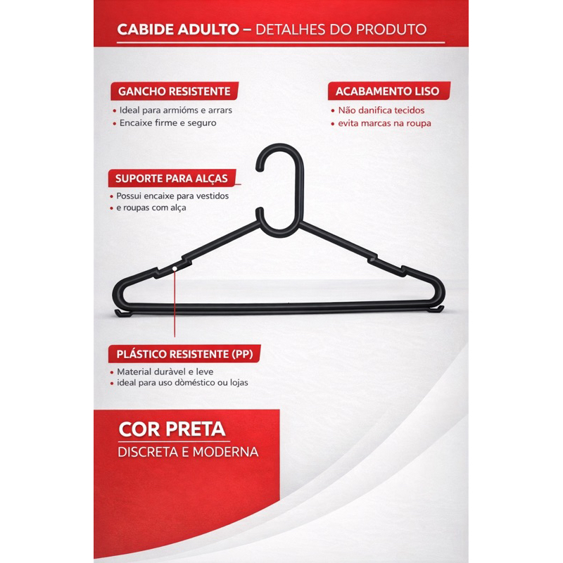 🔥 20, 30, 40 ou 50 UNIDADES DE CABIDE SIMPLES ADULTO PRETO Organize suas roupas com mais praticidade e resistência. O cabide adulto é fabricado em plástico reforçado (PP), ideal para uso diário em armários, araras e lojas de roupas. Seu design funcional possui suporte para alças, evitando que vestidos, blusas e peças delicadas escorreguem. Perfeito para quem busca organização, durabilidade e excelente custo-benefício. ✅ DIFERENCIAIS DO PRODUTO ✔ Plástico resistente e durável ✔ Acabamento liso que não marca nem danifica as roupas ✔ Suporte para alças (ideal para vestidos e regatas) ✔ Gancho firme para armários e araras ✔ Leve, prático e fácil de usar 📦 ESPECIFICAÇÕES • Material: Polipropileno (PP) • Cor: Preto • Tipo: Cabide adulto • Uso: Residencial ou comercial 💡 Ideal para: • Lojas de roupas • Closets • Armários • Organização do dia a dia
