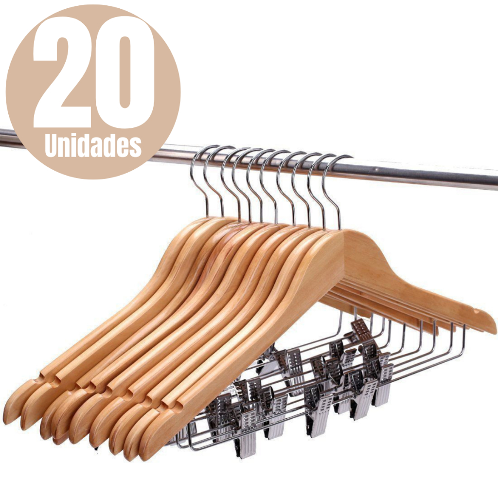 Kit 20 Cabides Madeira Presilha Marfim Envernizado Premium Adulto Saia Vestido Calça Bermuda