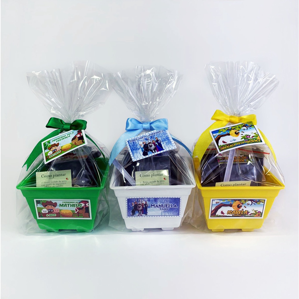 ATENÇÃO: ESTE KIT SEGUE MONTADO. (CONFORME FOTO) Lembrança Infantil Ecológica - Cachepô Kit Plantio Que tal mostrar para todos os seus convidados como você e sua família se preocupam em viver e ensinar sobre sustentabilidade? Para isto, escolha um presente que possa contribuir para a qualidade de vida das próximas gerações! Seja criativo e surpreenda seus convidados, presenteando-os com lembrancinhas ecológicas! Incentive as crianças a plantar por um futuro melhor! Cachepô personalizados com o tema de sua escolha! Veja as fotos acima e conheça algumas de nossas opções criadas carinhosamente para transformar a sua festa e criar um momento mais do que especial! Kit Lembracinha Ecológica: - Cachepô de plástico dimensões : 7 cm de altura x 9.2cm de largura x 9.2cm de profundidade - Saquinho de terra (Substrato Orgânico) - Saquinho personalizado com 4 sementes de Girassol - Pazinha para plantio - Embalagem em papel celofane com laço de fita de cetim, combinando com o tema escolhido - 3 TAGs (Tag com nome e idade, Tag da Semente e Tag de agradecimento) - Instrução de Plantio
