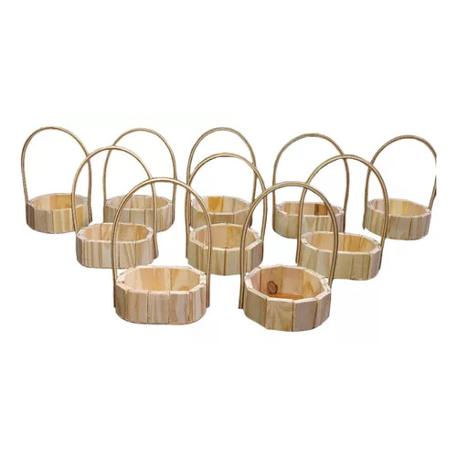 Kit com 20 Cestas De Madeira Fraldeira 10 redonda 13cm + 10 Oval 11X15 __________________________________________________ --Madeira de Pinus. --Alça de Fibra Sintética ( não quebra ) --Fundo: MDF de 3mm. _______________________________________ Medidas: Redonda: Largura: 13 cm Altura sem alça: 5cm Altura com alça: 24cm _____________________________ Oval: Largura: 11x15 cm Altura sem alça: 5cm Altura com alça: 24cm ________________________________________________________ - Todos os produtos são fabricados de forma artesanal, podendo assim haver diferenças em relação as medidas informadas. Produto artesanal podendo ocorrer alterações na cor, acabamento e tamanho