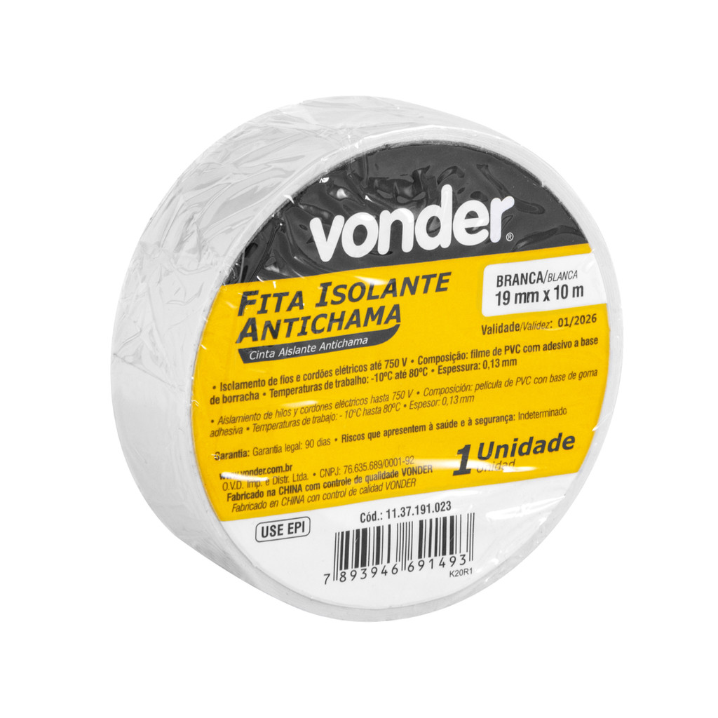 Kit com 20 Fitas Isolantes Brancas 19mm x 10m - VONDER A Fita Isolante VONDER, com 19 mm de largura e 10 m de comprimento, oferece segurança e eficiência para isolar fios e cabos elétricos. Fabricada em filme de PVC com adesivo à base de borracha, garante alta aderência e durabilidade, sendo ideal para instalações elétricas residenciais, comerciais e industriais. Diferenciais do Produto: Resistência Térmica: Suporta temperaturas de trabalho entre -10°C e 80°C. Propriedade Antichama: Oferece maior segurança em instalações elétricas. Alta Tensão de Isolamento: Suporta até 750 V, garantindo proteção confiável. Material de Qualidade: Filme de PVC com adesivo à base de borracha proporciona boa aderência e durabilidade. Especificações Técnicas: Espessura: 0,13 mm Largura x Comprimento: 19 mm x 10 m Cor: Branca Peso Aproximado: 0,006 kg por unidade Garantia: 90 dias (legal) Vantagens do Kit com 20 Unidades: Adquirindo o Kit com 20 Fitas Isolantes VONDER, você garante melhor custo-benefício, reduzindo o valor unitário e garantindo ainda mais economia. Ideal para profissionais que realizam diversas instalações e necessitam de um suprimento maior de fita isolante de qualidade. Aposte na segurança e durabilidade da Fita Isolante VONDER e garanta um isolamento confiável para suas instalações elétricas!