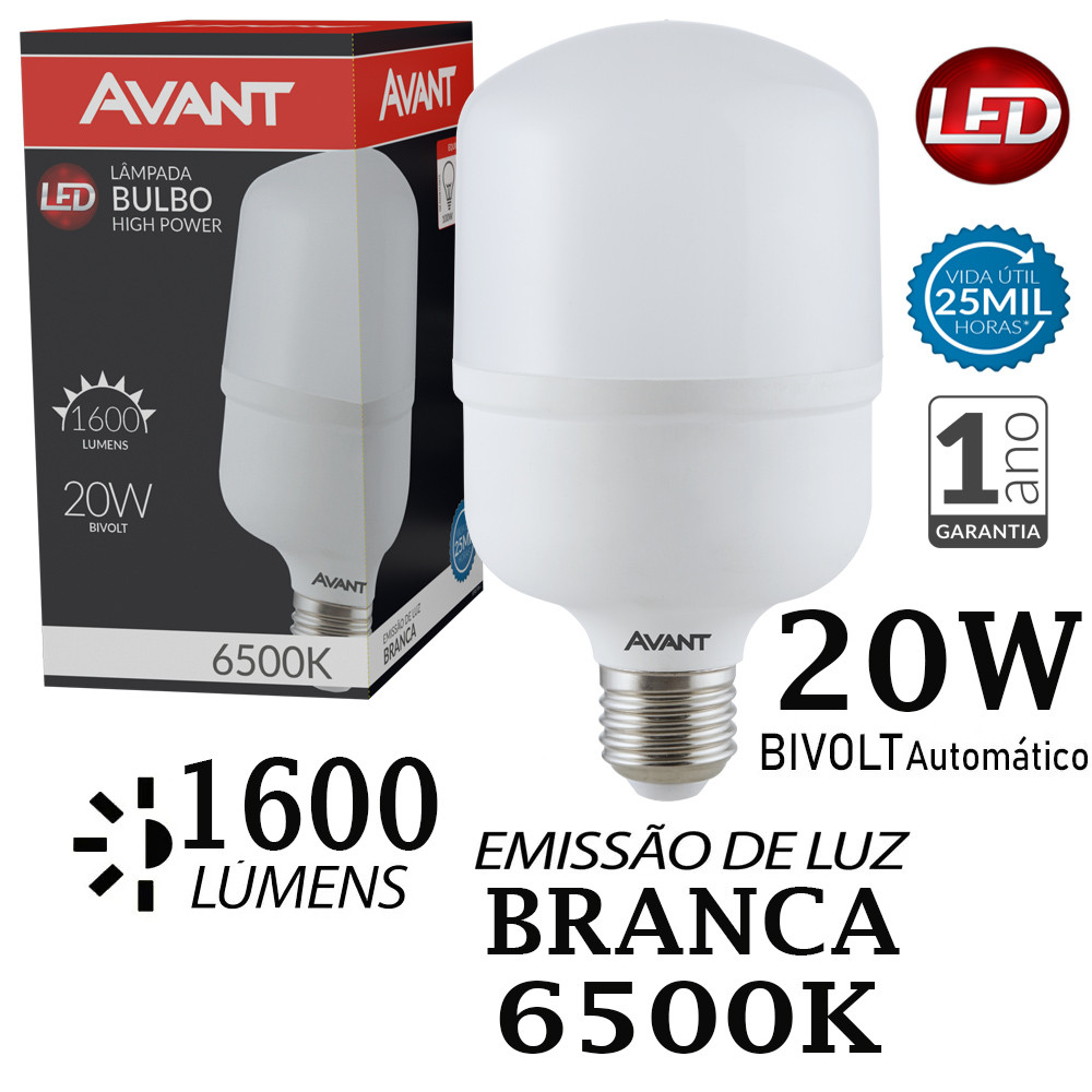Kit 20 Lâmpada Bulbo Hp 20W Luz Branco Frio 6500K Bivolt 127v 220v Led Soquete E27 Avant