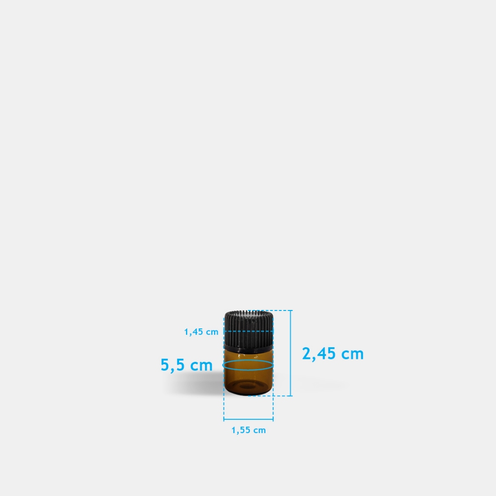 Esse kit contém 20 unidades de mini frascos de vidro na cor âmbar. Os mini frascos tem capacidade de 1 mL. A tampa estilo gotejador facilita aplicação. Composição: Frasco vidro âmbar Tampa gotejador em plástico transparente Tampa fechamento em plástico preto Tamanho ( medida inclui a tampa): Altura= 1,9 cm margem de erro ± 2mm Diâmetro do corpo = 1,5 cm ± 2mm Peso: 3g ± 0,5mm Características: Volume capacidade máxima de 1,2 mL Proteção Âmbar Tampa tipo rosquear anti deslizante