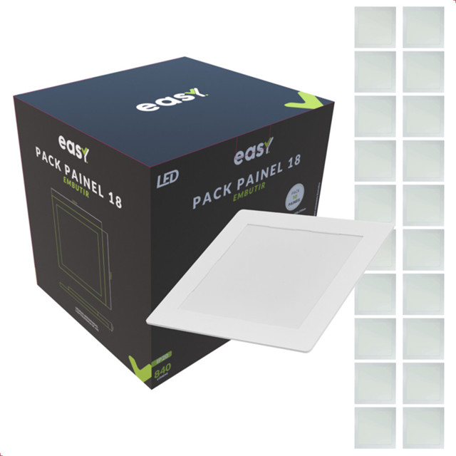Kit com 20 Painel de Led - Easy Ilumine seus ambientes com o Kit de 20 Painéis de LED Easy, a solução ideal para quem busca economia de energia e alta performance! PROPRIEDADES: Construção livre de mercúrio Possui ajuste manual de direção da luz Acabamento em policarbonato na cor branca Baixo consumo de energia CARACTERÍSTICAS DE FUNCIONAMENTO: Tensão nominal: 100V a 240V (BIVOLT) Fator de potência: >0,50 Baixo consumo de energia FUNCIONAMENTO: Temperatura ambiente: -5°C a 40°C Tensão de entrada: 100V a 240V Fator de potência: >0,50 Tipo de Instalação: Embutir e Sobrepor IP20 Vida média: 15 mil horas ESPECIFICAÇÕES TÉCNICAS E COMERCIAIS (Item 399190577): Modelo: LED-PAINEL-EASY-EMB-QUA-AM3000K-18W-BIVOLT-BF-PACK10-PS Código de Barras: 7899452031587 Potência: 18W Temperatura de Cor: 3000K Fluxo Luminoso: 840 lm Eficiência Luminosa: 70 lm/W Peso: 25g Dimensões: 120 x 120 mm Múltiplo de Vendas: 20 GARANTIA: Oficial Easy de 12 meses para defeitos de fabricação. Sobre a Marca Easy: A Easy é uma marca reconhecida por oferecer produtos de iluminação LED de alta qualidade e durabilidade. Com foco na eficiência energética, a Easy desenvolve soluções inovadoras que aliam performance e economia, contribuindo para um futuro mais sustentável.