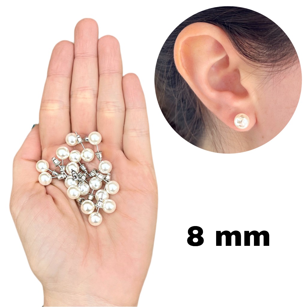 Ao efetuar a compra, você receberá 20 pares. No ato da compra, selecione qual medida deseja receber. São brincos de pérola (bijuteria) enviados soltos (não acompanham cartelas). Ideais para revenda, ótimo custo benefício. Não são antialérgicos.