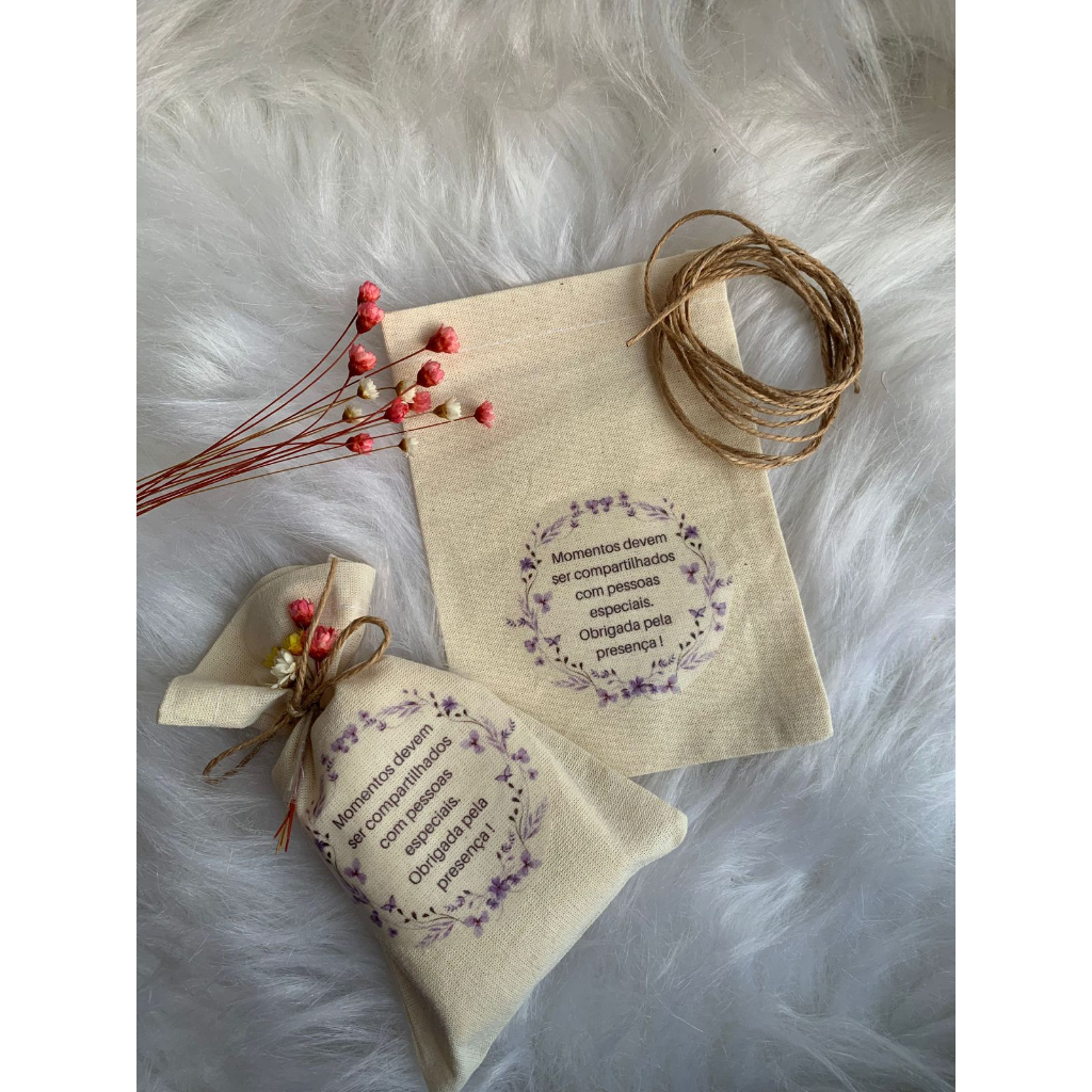 Saquinho 100% algodão crú gramatura média 240( não é transparente)` Cordão ráfia fracionado para a quantidade solicitada. Flores artificiais sempre viva fracionada para a quantidade solicitada. Anúncio refere-se a 20 unidades do tamanho 10x15 personalizado (com arte própria, inspiração, iniciais dos noivos, nome do bebê e logomarca). Produto segue para personalização com transfer (vem dá abreviação de ``transferência``, é uma técnica de impressão em que é possível transferir a imagem de um papel especial para várias superfícies variadas), lembramos que o tamanho da arte é 5x5cm. Produto artesanal feito manualmente 1 a 1 desde o corte até o produto final . Por ser um produto 100% artesanal pode haver uma mínima diferença de um para o outro Pode haver variação na cor devido a calibragem do seu monitor, lembrando também que o nosso produto é 100% natural, levemente amarelado, o que também ocasiona diferença e a não fidelidade da cor visualizada na tela. Atenção Devido ser um produto sob encomenda, tenha certeza do tamanho solicitado, pois após sua confecção não tem possibilidade de troca. Utilizando saquinhos em algodão , vc ajuda a natureza, diminuindo a quantidade de sacos plásticos descartados, nossos saquinhos tem durabilidade, podendo ser lavado e reutilizado por algumas vezes.