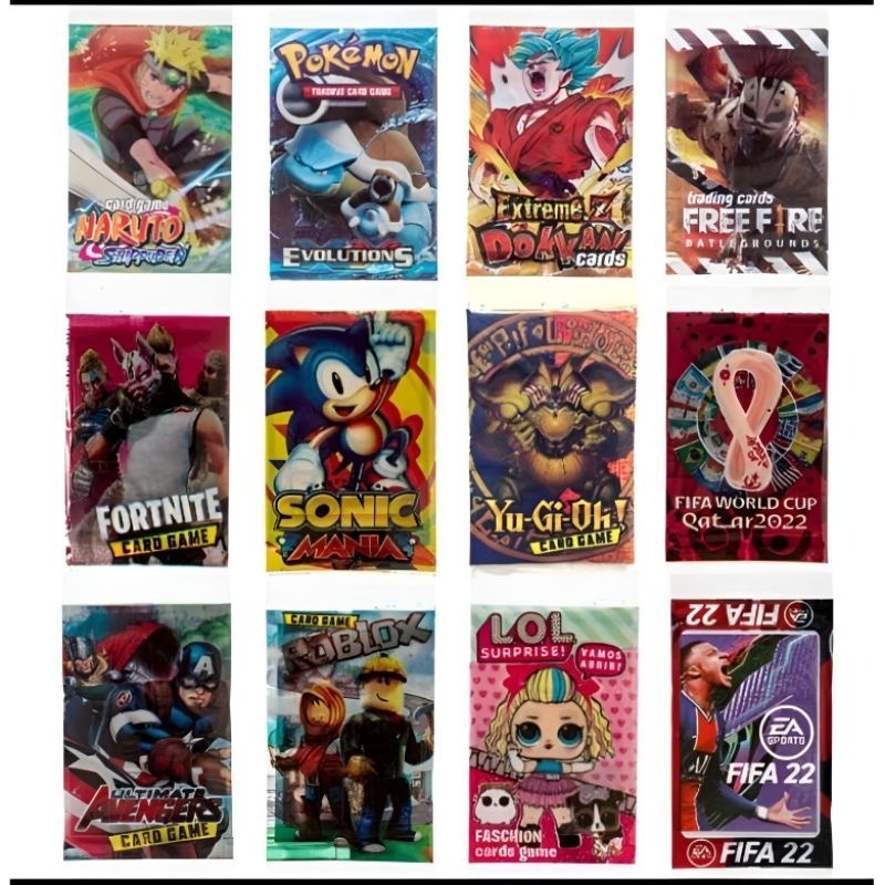 Mega Kit com 200 Cards Misturados, 50 pacotinhos com 4 cards em cada. Totalizando 200 cards Serão enviados misturados com diversos temas como: - Naruto, Dragon Ball, Homem Aranha, Pokemon, Fifa 24, Sonic, Vingadores, Free Fire, GTA 5, Clash Royale Serão montados com os cards disponíveis no estoque.