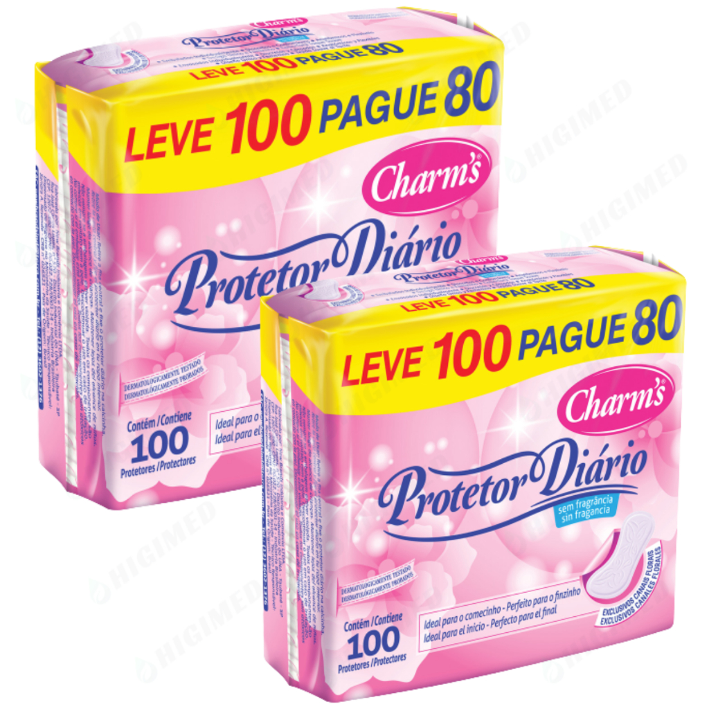 Bem vindo à Higimed, ficamos felizes em ter você aqui. Este kit compõe 2 embalagens com 100 unidades cada, de protetor de uso Diário da Charm's. Proteção para o dia a dia. Dermatológicamente testado. Sem fragrância. Exclusivos Canais florais. Embalados individualmente, discretos e confortáveis, anatômicos e flexíveis, design único e feminino, cobertura toque suave.