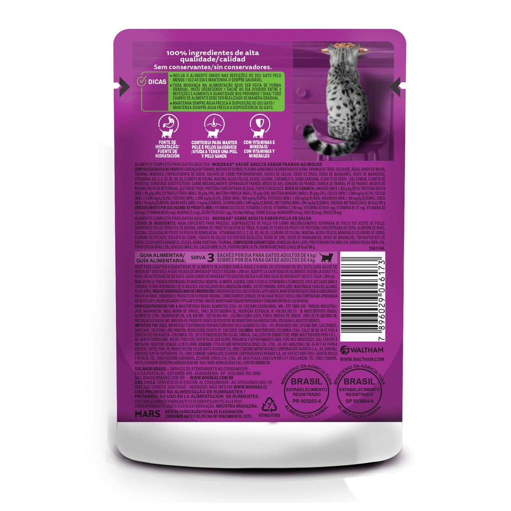 Inclua a Ração Úmida Whiskas Sachê Frango ao Molho para Gatos Adultos 85 g nas refeições do seu gato pelo menos 1 vez ao dia e mantenha-o sempre saudável. Toda mudança na alimentação deve ser feita de forma gradual. Inicie oferecendo 1 sachê ao dia dividido entre 2 refeições e aumente a quantidade nos próximos 7 dias. Mantenha sempre água fresca à disposição do seu gato.