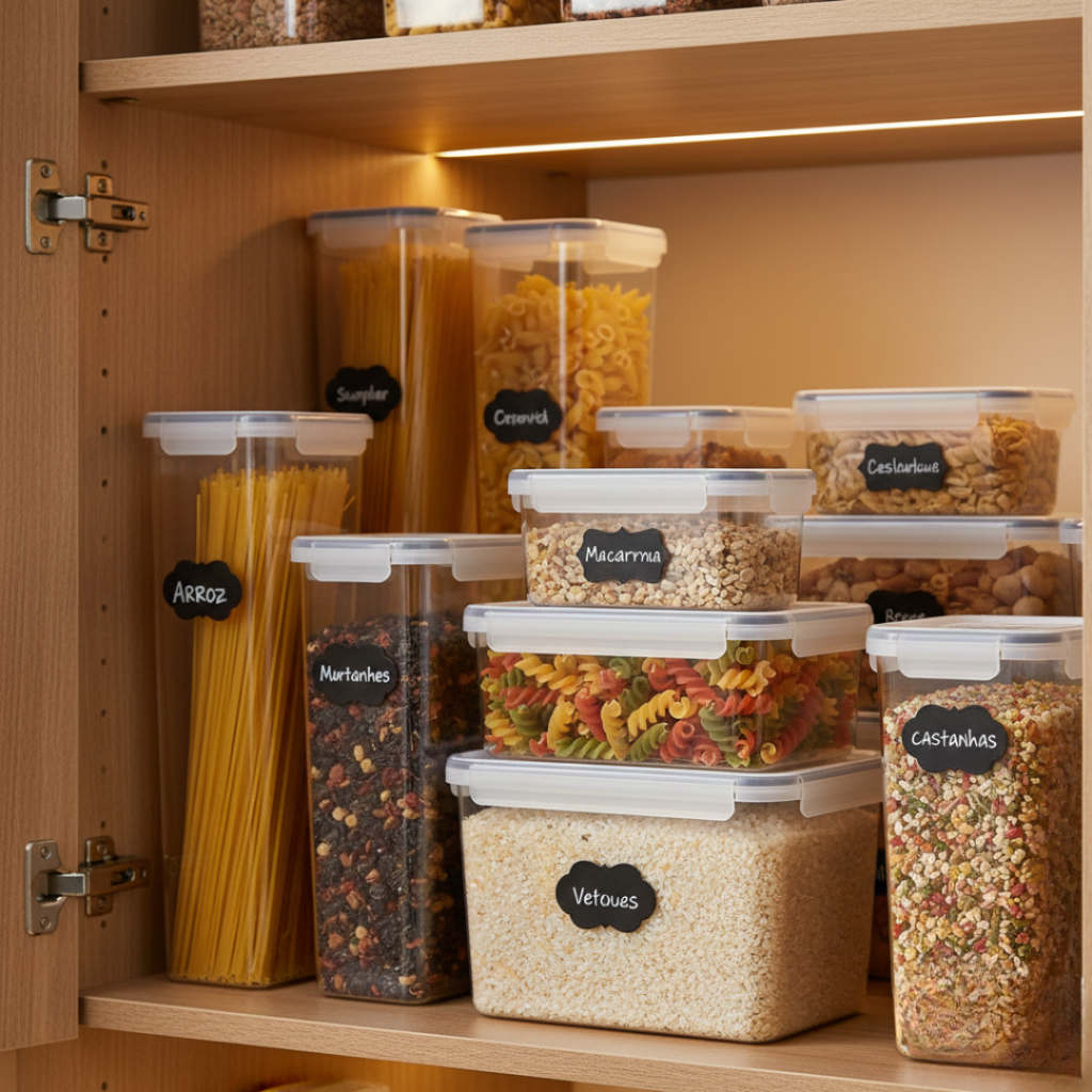 Conjunto de Potes Herméticos Premium – 21 Peças Transforme sua organização com o kit mais completo do mercado! Este conjunto foi desenvolvido para quem busca praticidade, segurança e uma cozinha impecável. Com 7 tamanhos diferentes, você terá a solução ideal para armazenar desde grandes quantidades de grãos até pequenas porções de temperos. 📦 Conteúdo do Pacote (21 Potes): 3 Recipientes Extra Grandes (2,8 L) – 15 x 10,5 x 30 cm 3 Recipientes Grandes (2,0 L) – 15 x 10,5 x 21 cm 3 Recipientes Médios (1,4 L) – 15 x 10,5 x 15 cm 3 Recipientes Pequenos (0,8 L) – 15 x 10,5 x 10 cm 3 Recipientes Extras Pequenos (0,52 L) – 15 x 10,5 x 6,5 cm 3 Recipientes Mínis (140 ml) – 8,5 x 8,5 x 6 cm 3 Recipientes Micro (60 ml) – 5 x 6,5 x 5 cm 🎁 Itens Inclusos para Identificação: 1 Caneta de Giz Branco 21 Etiquetas Adesivas Reutilizáveis (Quantidade de etiquetas igual à quantidade de potes) 💎 Diferenciais do Produto: Vedação Hermética Total: Tampas com 4 travas laterais e anel de silicone que impedem a entrada de ar e umidade, conservando os alimentos frescos por muito mais tempo. Design Inteligente e Empilhável: Otimize o espaço em armários, geladeiras e despensas. As tampas possuem design universal, facilitando o encaixe em qualquer tamanho de pote após a lavagem. Material de Alta Qualidade: Fabricados em plástico transparente premium, livre de BPA (BPA Free), sem cheiro e totalmente seguro para sua família. Versatilidade: Ideal para cereais, massas, grãos, petiscos, farinhas, temperos e até ração para pets. ⚠️ Instruções de Uso e Cuidados: Micro-ondas: Pode ser utilizado para aquecimento, porém a tampa deve ser removida obrigatoriamente. O anel de silicone da tampa pode ser danificado se exposto ao calor direto do micro-ondas. Limpeza: Fáceis de lavar e compatíveis com máquina de lavar louça (recomenda-se a prateleira superior). Armazenamento: Seguros para uso em freezer e geladeira. Por que escolher nosso kit? Diferente de imitações, nossos potes oferecem vedação real e transparência cristalina para facilitar a visualização do conteúdo. É a escolha perfeita para organizar sua casa ou presentear alguém especial! Garanta já o seu e leve o padrão de organização profissional para sua cozinha!
