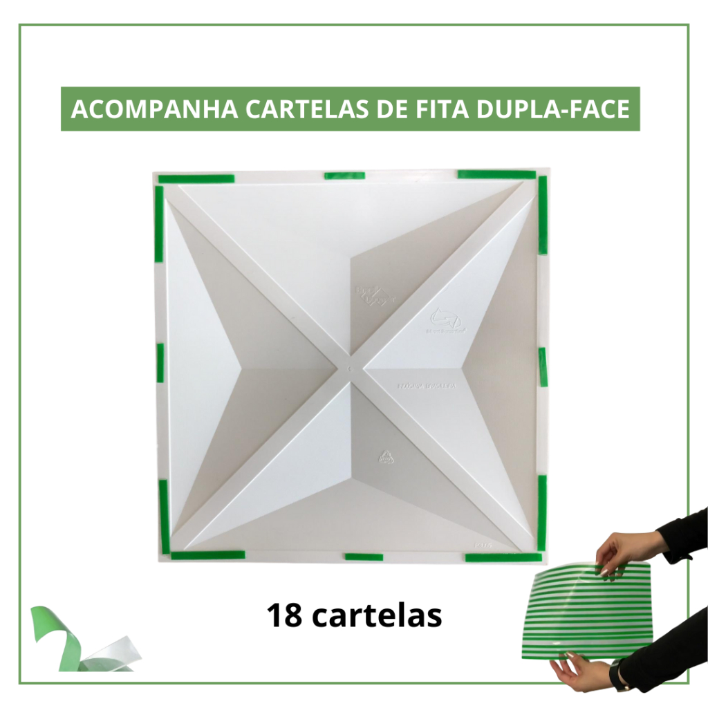 Revestimento 3D Autocolante - Modelo Diamante 📦 Venda por caixa: 22 peças | Cobre até 2m² 📏 Medida da peça: 30x30cm | Espessura: 6mm 🛠 Instalação fácil com fita dupla-face (inclusa cartela de fitas) 🔧 Corte simples com serra de arco ♻ Reaplicável: leve para seu novo ambiente trocando a fita 💪 Composição: Plástico de engenharia anti-impacto 🚫 Venda apenas por caixa 🌿 Indicadas para ambientes internos (exceto banheiros) ⚠ Contraindicações: não aplicar perto de fogo, em tetos ou em paredes irregulares, úmidas ou com mofo 🧼 Para aplicação sobre azulejos, limpar com álcool antes 🎨 Atenção: pode haver variação de tonalidade entre lotes