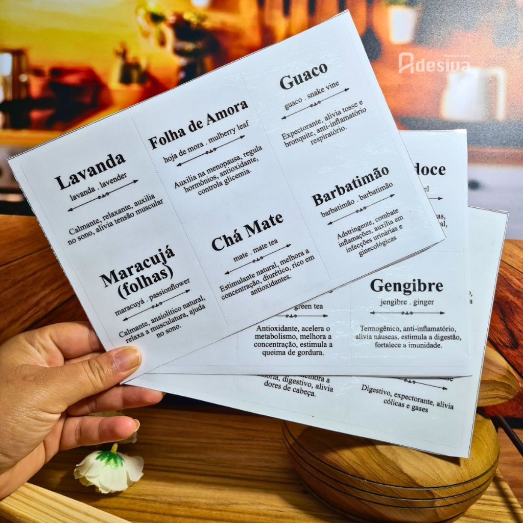 🏷️ FICHA TÉCNICA ✔ Quantidade: 24 unidades (adesivos apenas, não acompanham os potes) ✔ Tamanho: 7x7 cm ✔ Material: Vinil transparente (resistente à água e durável) ⚠️ Atenção: O adesivo em vinil transparente possui algumas limitações: ❌ Não recomendado para superfícies escuras (a transparência pode comprometer a leitura). ✨ POR QUE ESCOLHER NOSSOS ADESIVOS? 💦 À prova d’água: Ideais para potes e recipientes expostos à umidade. 🎨 Impressão em alta resolução (1400 dpi): Letras nítidas e legíveis, sem borrões. 📌 Fácil aplicação: Adesivos cortados individualmente – é só destacar e colar! 💪 Durabilidade garantida: Feitos em vinil de alta qualidade, não desbotam nem rasgam facilmente. 📦 Organização e praticidade: Deixe sua cozinha mais funcional e bonita com etiquetas bem definidas! 🫖 Quais são os nomes inclusos? Camomila, hortelã, erva-doce, canela, melissa, boldo, capim-limão, chá verde, gengibre, cavalinha, alecrim, anis-estrelado, carqueja, urtiga, jasmim, lavanda, folha de amora, guaco, tília, alcachofra, dente-de-leão, maracujá (folhas), chá mate e barbatimão. 📩 Ficou com dúvidas? Fale conosco no chat, teremos prazer em te ajudar! 🛍️ Agradecemos sua compra! Conte sempre com a qualidade da Equipe Adesiva 💖