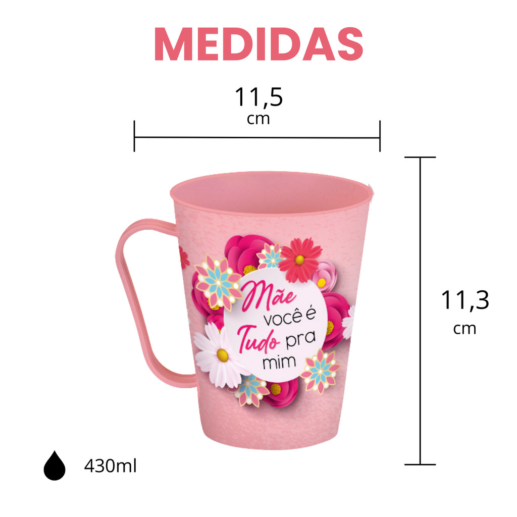 Kit Canecas Decoradas Dia das Mães 430ml Características do produto: ✅ Capacidade ideal de 430ml, perfeita para café, chocolate quente, suco ou refrigerante. ✅ Design Dia das Mães, com estampas. ✅ Feita em plástico virgem 100% livre de BPA, resistente e segura. ✅ Pode ir ao micro-ondas e à máquina de lavar louças. ✅ Tecnologia In Mold Label — cores vivas e duradouras que não desbotam. Você vai receber em sua casa: 📦 canecas Dia das Mães Sortidas de 430ml cada de acordo com a quantidade escolhida Recomendações de Uso: 👉 Ideal para festas, presentes ou decorações natalinas. 👉 Lave com sabão neutro e esponja macia para maior durabilidade.