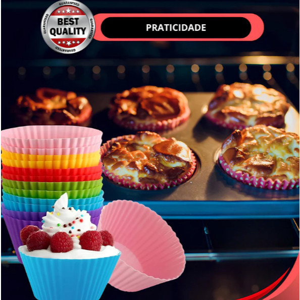 Forminhas de Silicone para Cupcake – Kit com 24 Peças Nossas forminhas para cupcake são produzidas em 100% silicone premium de qualidade alimentar, com material espesso e resistente, que não deforma com facilidade. O conjunto é impermeável, insípido, seguro e durável, garantindo praticidade e resultados perfeitos em todas as receitas. As forminhas são naturalmente antiaderentes, permitindo desenformar os bolinhos com facilidade. Além disso, são reutilizáveis, flexíveis e muito mais práticas do que as formas tradicionais de metal. Características Suportam temperaturas de -40°C até 240°C. Podem ser usadas no forno, air fryer, micro-ondas, geladeira, freezer e lava-louças. Livre de BPA, garantindo segurança e qualidade. Medidas: 7 cm de diâmetro, 3 cm de altura, capacidade de 70 ml cada. Base com 4,6 cm de diâmetro e topo com 6,5 cm. Kit com 25 forminhas em cores sortidas (não é possível escolher as cores, o kit já vem pronto de fábrica). Cozimento uniforme As forminhas de silicone garantem um cozimento uniforme e deixam os cupcakes e muffins douradinhos por igual. Diferente das formas de metal, elas esfriam rapidamente, interrompendo o processo de cozimento logo após saírem do forno, o que deixa sua receita ainda mais no ponto certo. Fácil de limpar Podem ser lavadas com água morna e sabão ou na lava-louças. São resistentes, leves e flexíveis: não quebram, não enferrujam e não ficam amassadas. Totalmente reutilizáveis, sendo uma opção mais econômica e sustentável para sua cozinha. O que vem no kit Kit 24 forminhas de silicone para cupcakes, muffins, empadinhas e muito mais. Ou Kit 2- 48 forminhas de silicone para cupcakes, muffins, empadinhas e muito mais. Cores sortidas (não é possível escolher). Vantagens das forminhas de silicone Antiaderentes e fáceis de desenformar. Resistentes a altas e baixas temperaturas. Reutilizáveis e ecológicas. Mais práticas e duráveis que as formas tradicionais. Tamanho perfeito para cupcakes e muffins caseiros.